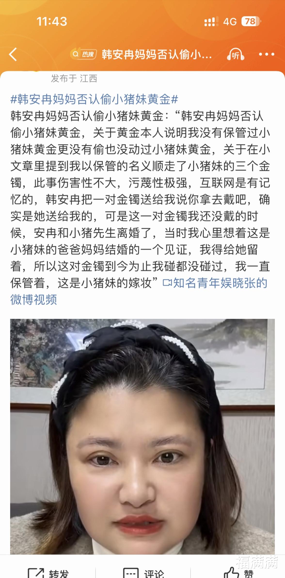 这事儿闹得沸沸扬扬,网上传言韩安冉妈妈以保管之名顺走了小猪妹三个金镯。现在韩安冉妈妈亲自下场回应,言辞凿凿地表示自己从未保管过小猪妹的黄金,更不存在偷拿行为,还强调这种说法污蔑性极强。