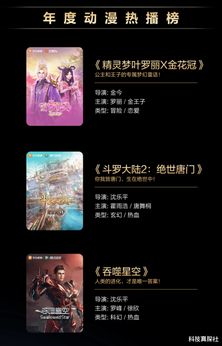 还有年度动漫热播榜,《精灵梦叶罗丽X金花冠》《斗罗大陆2:绝世唐门》和《吞噬星空》三部作品成功登顶。无论是唯美的画面,还是精彩的剧情,都吸引了无数动漫爱好者。在华为视频上追番,也正在成为新潮流!