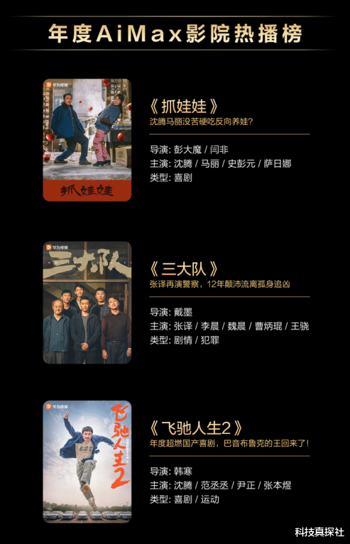 年度AiMax影院热播榜,为我们带来了《抓娃娃》《三大队》和《飞驰人生2》这三部高品质佳作。必须要提一下《抓娃娃》,轻松幽默的剧情让人捧腹大笑,在AiMax影院的加持下,画质音效更上一层楼,绝对是放松心情的绝佳选择!其他两部影片也都是口碑之作,在华为视频的影院级体验下更显精彩。要知道,AiMax影院可是华为视频的独家优势,最高可达4K高清画质、HDR Vivid菁彩影像和Audio Vivid菁彩声,并可以基于AI能力至臻还原音画质细节,让用户声临其境感受故事现场。在华为视频AiMax影院里看电影大片,色彩更鲜艳,细节更清晰,音效更震撼,仿佛置身于电影场景之中。特别是对画面细节和音效有极致追求的