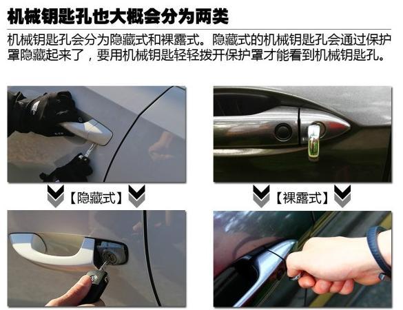 有人说,我的车上也没有钥匙孔啊,找到钥匙又有什么用?其实有些车型为了外观更加美观,用保护罩把机械钥匙孔隐藏起来了。使用时要用机械钥匙轻轻拨开保护罩才能看到机械钥匙孔。