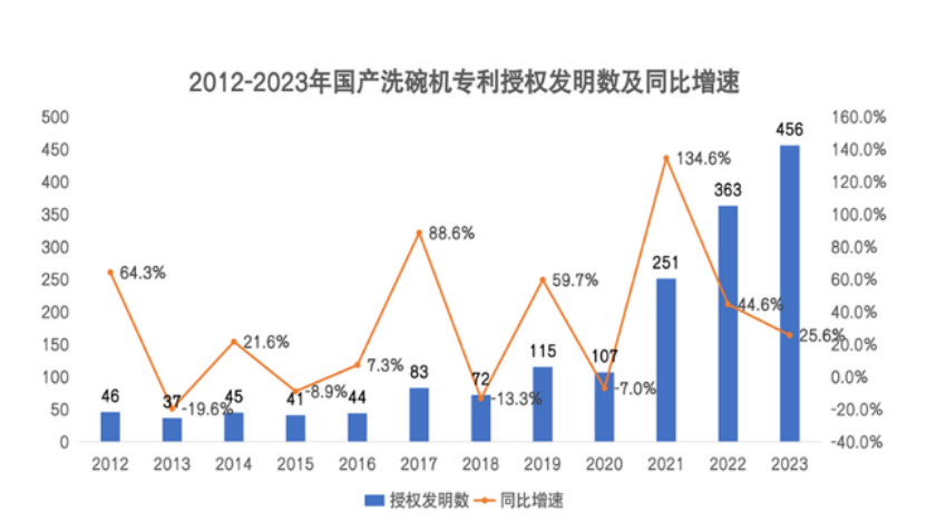 据国家工业信息安全发展研究中心、工信部电子知识产权中心联合发布的《中国洗碗机专利创新研究报告(2024)》显示,截至2023年年底,中国洗碗机市场全渠道销售量近10年复合增长率达到32.1%;2023年当年授权发明专利数达到456件,较10年前的2012年的46件提升了近10倍。