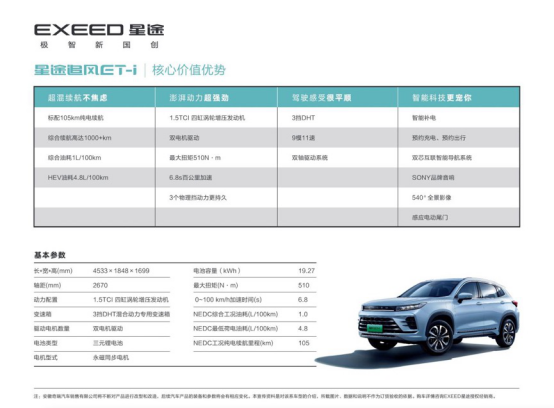 4大核心价值加持,实现日常使用场景全覆盖具体到星途追风ET-i产品层面,“超混续航不焦虑”、“澎湃动力超强劲”、“驾驶感受很平顺”、“智能科技更宠你”的四大产品优势,保证了用户优秀的用车体验。“超混续航不焦虑”——星途追风ET-i车型在续航以及油耗方面,星途追风ET-i凭借多场景下的最佳工况匹配,动力系统的最高传递效率可达97.6%。同时采用了更多在高端车型上才会配备的CRBS能量回收系统,在减速制动时,可以实现能量再回收,节能高效。从而实现了NEDC工况电驱动平均效率>90%,标准版纯电续驶里程可达105km,综合续驶里程超过1000km的优异续航表现。在油耗方面,星途追风ET-i的表现尤其抢眼,综合油耗可以达到1L/100km,馈电油耗可达4.8L/100km,让消费者在尽享强动力、长续航优势的同时,还能保持极低的用车成本。在动力上,星途追风ET-i通过其搭载的1.5TCI“最强中国心”四缸涡轮增压发动机与全功能DHT变速箱内集成的2台电机相互配合,实现了最大输入功率为240kW、最大扭矩510N·m、百公里加速6.8S的亮眼数据,彻底解决了混动车型动力弱的根本痛点。与第一代混动技术相比,星途追风ET-i的双电机均可直接参与驱动,是当下中国汽车市场上唯一配备三项动力源智能组合的车型,相较于其他混动产品具备代差级别性能优势。