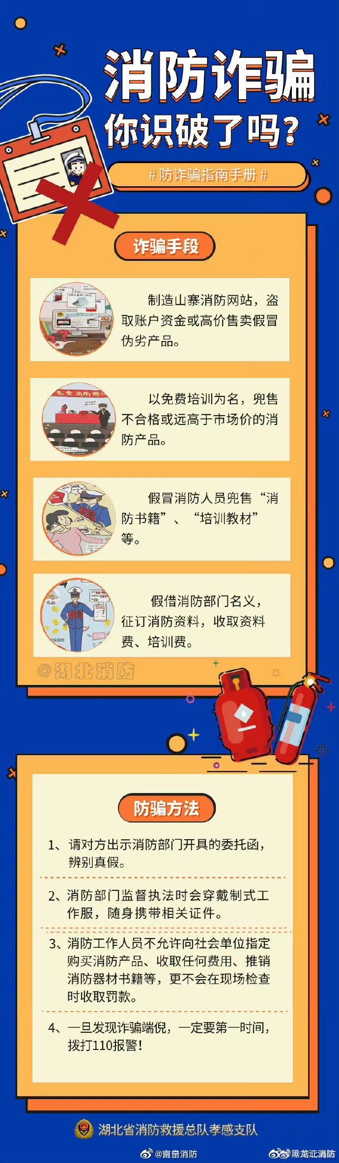 【消防诈骗,你识破了吗?】消防诈骗,是指一些不法分子假借“消防”名义,使用不同手段,进行骗钱骗物的诈骗行为。阿消提醒大家,要保持高度警觉,提高防范意识。戳图,赶快了解一下骗子们常用的消防“诈骗套路”吧!