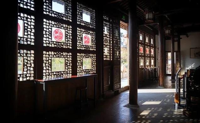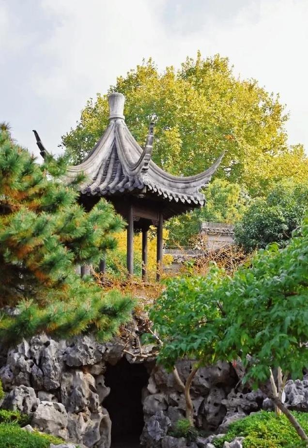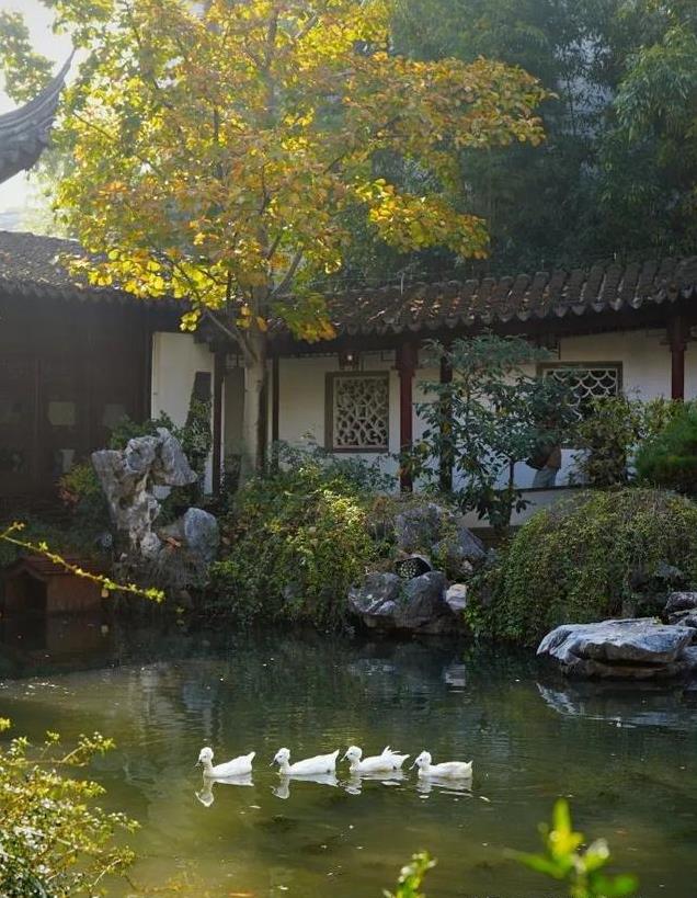 冬日暖阳下斑斓的枝叶点缀着小巧而精致的园林光影的流动赋予一汪池水灵动的气质白墙灰瓦、亭台楼阁仿佛一幅素雅的国画