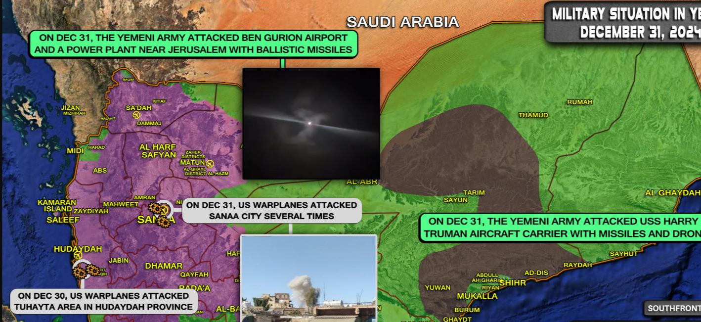 也门胡塞武装也没有退缩,发动进一步打击,在2024年12月31日,使用“巴勒斯坦-2”高超音速弹道导弹瞄准本·古里安机场,“佐勒菲卡尔”弹道导弹打击了耶路撒冷南部的一座发电站,具体战果不明,以色列不承认。在美军准备空袭之前,也门胡塞武装对美国海军杜鲁门号航母发射了数架无人机和反舰巡航导弹。美国中央司令部证实,在交战中,击落了七枚巡航导弹和自杀式无人机。