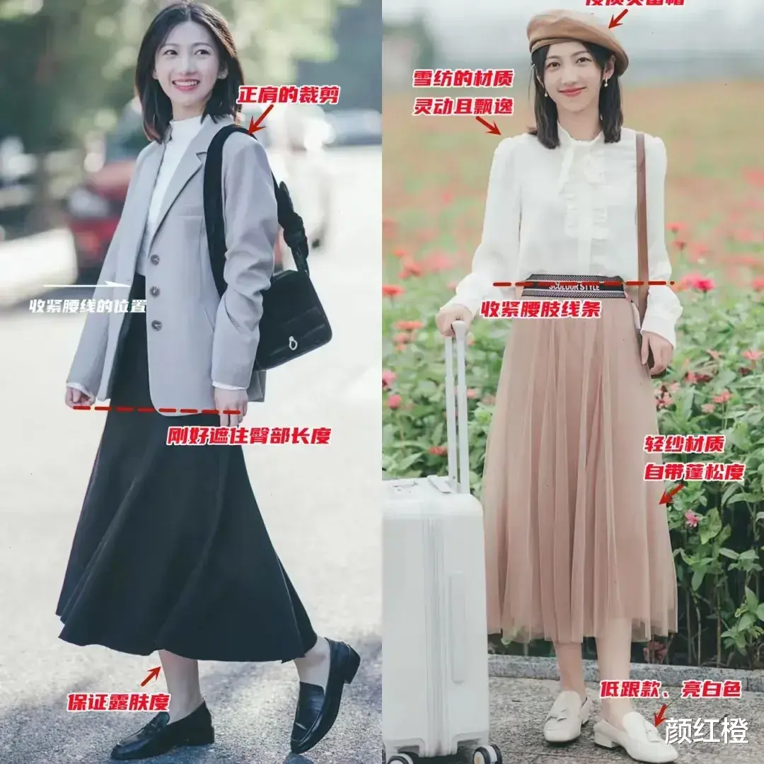 我们还可以采用上短下长的搭配技巧,例如下面这两位博主就用了短款的外套搭配上散装的半身裙,脚踩上一双浅口的单鞋,只要把内搭的衣服一角扎进裙子里面就能很好的提升腰线,非常适合小个子女生穿搭。