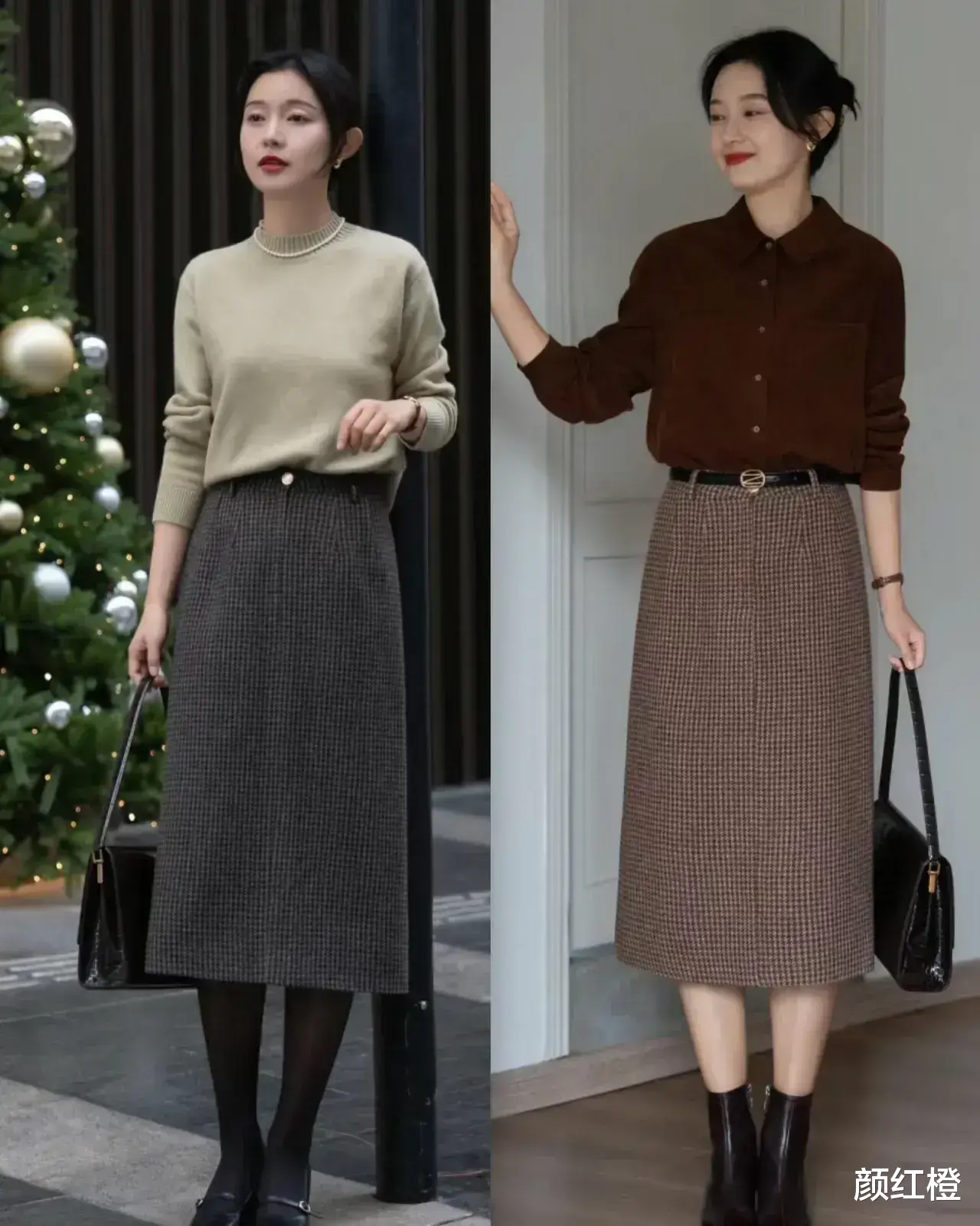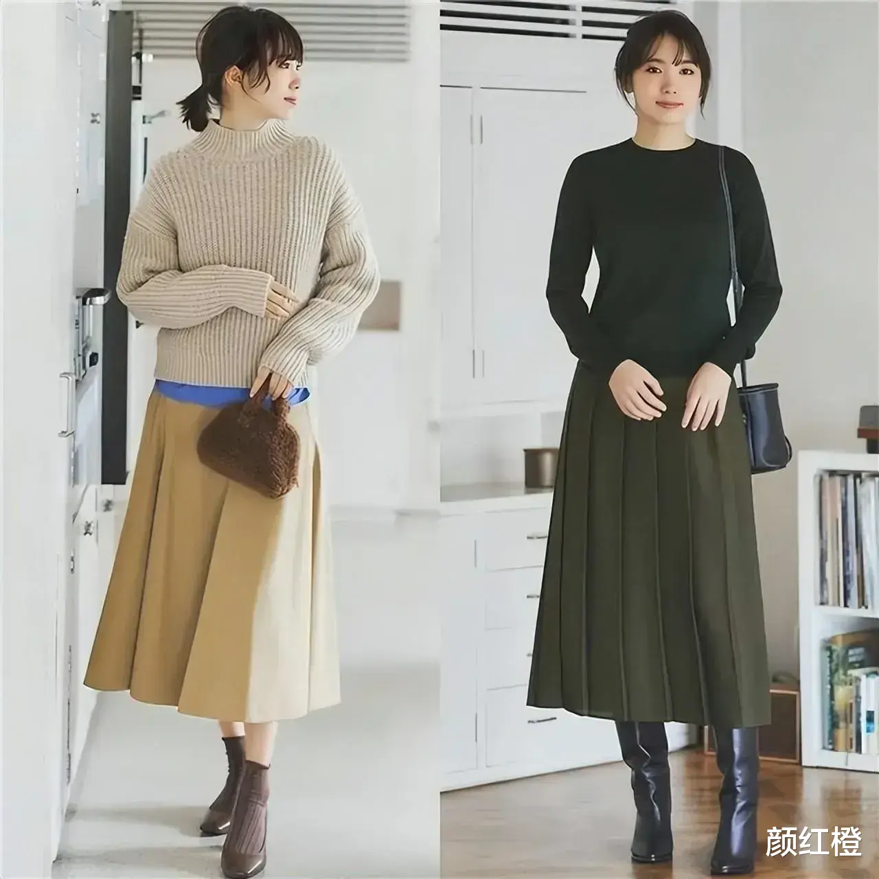 对于成熟女性来说,我个人还蛮推荐选择百褶裙或者压褶半身裙来搭配的百褶半身裙穿在身上之后更有量感,垂坠感十足,而且裙摆是外扩的款式更自由,例如下面这两套穿衣造型分别是用一件针织上衣和黑色的半身裙进行组合搭配,呈现出来的视觉效果就很大气,另一套是用杏色的短袖上衣和黄色的鸭子半身裙搭配,散发出来的气质也很高级,而且遮肉显瘦不压身。