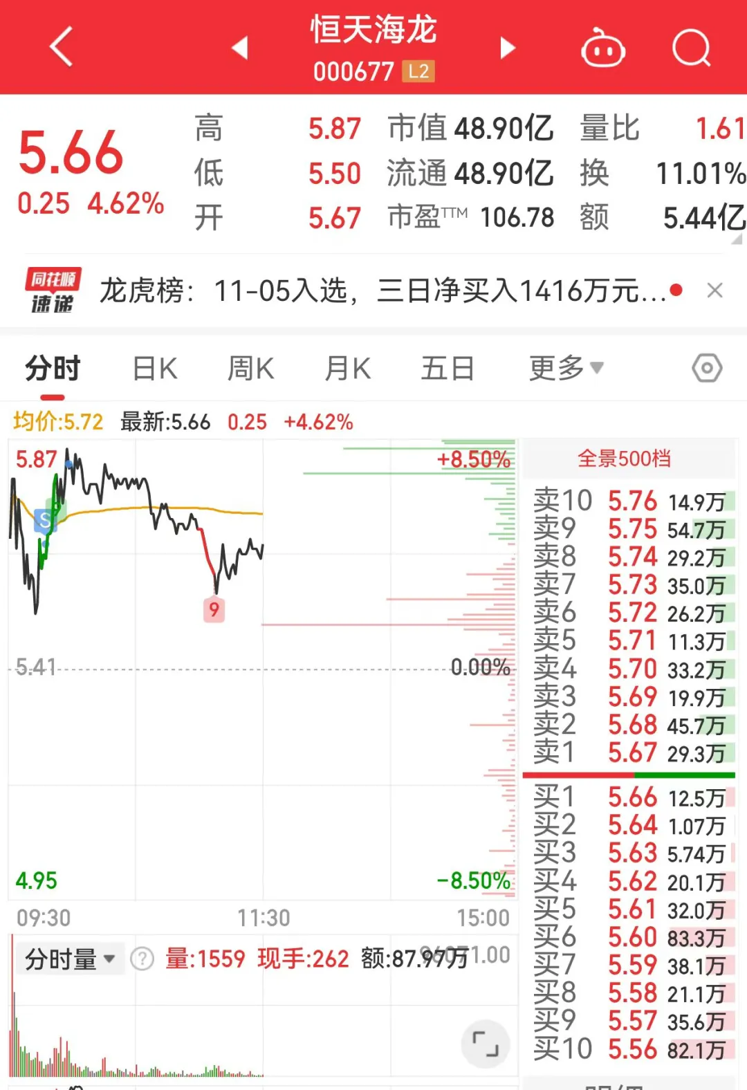7、恒天海龙,相对比较后排,卖了他切核心中信海直和深城交,恒天海龙拿了很久了,从赚40个点到负,然后今天冲高赚钱走人了;