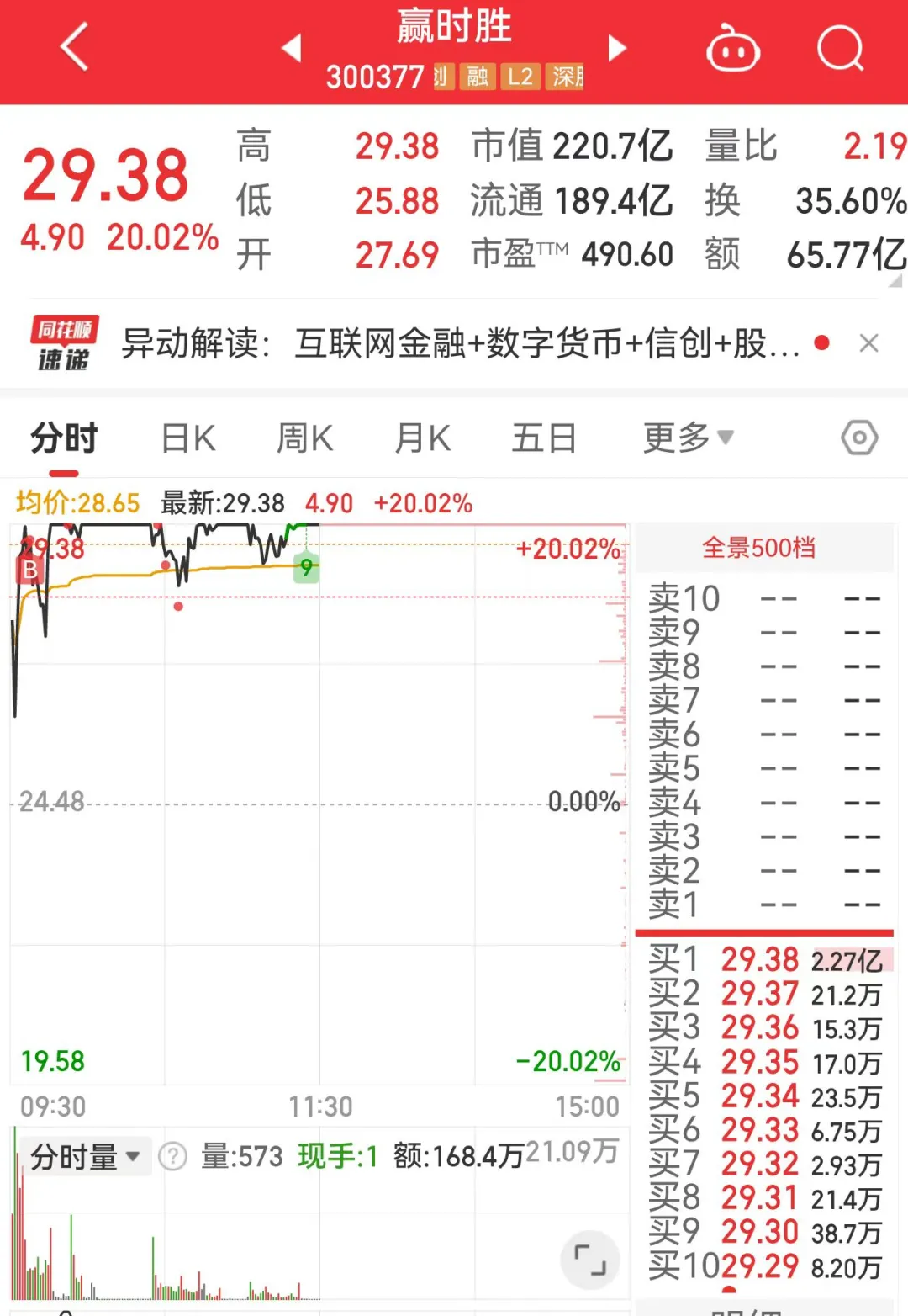 4、第一创业走的比较弱,东方财富也就没加仓,后面1个多点卖了东方财富,切去了最强的赢时胜。