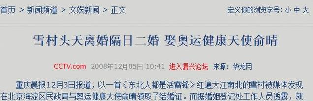 雪村头天离婚隔日二婚 娶奥运健康天使俞晴= 2008年12月05日 10:41来源:华龙网
