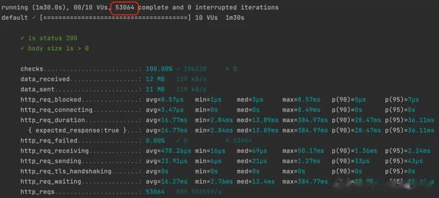 $ k6 run -d 90s -u 10 load-tests.js以下是执行k6测试后打印的示例结果:
