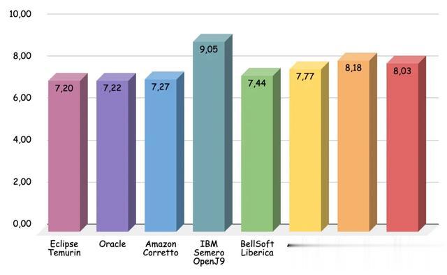 Eclipse Temurin: 7.20sOracle OpenJDK: 7.22sAmazon Corretto: 7.27sBellSoft Liberica: 7.44sOracle OpenJDK: 7.77sAlibaba Dragonwell: 8.03sMicrosoft OpenJDK: 8.18sIBM Semeru OpenJ9: 9.05s这是我们结果的图形表示。供应商之间的差异有时是表面上的。也许,如果同样的测试从头再来一次,结果会大不相同。