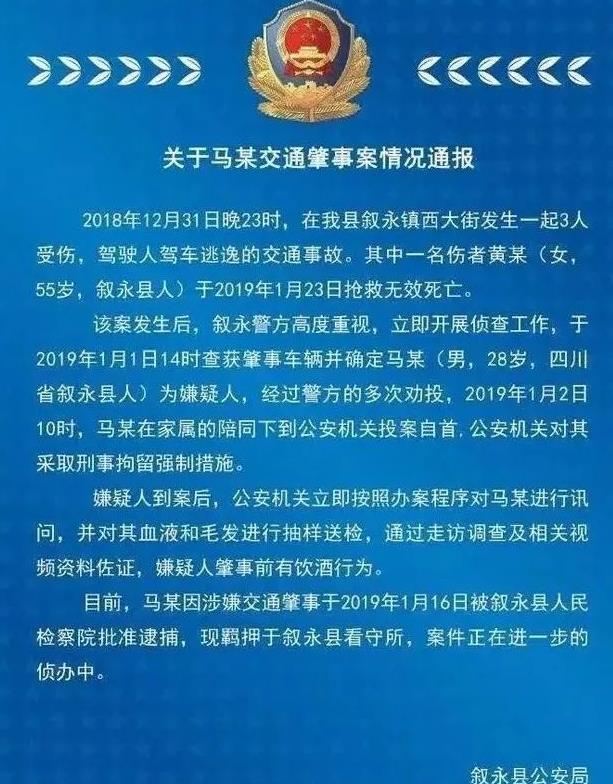 2019年元旦前夕,马明弘因为酒驾飙车,导致知名艺人谭松韵的母亲被撞身亡。