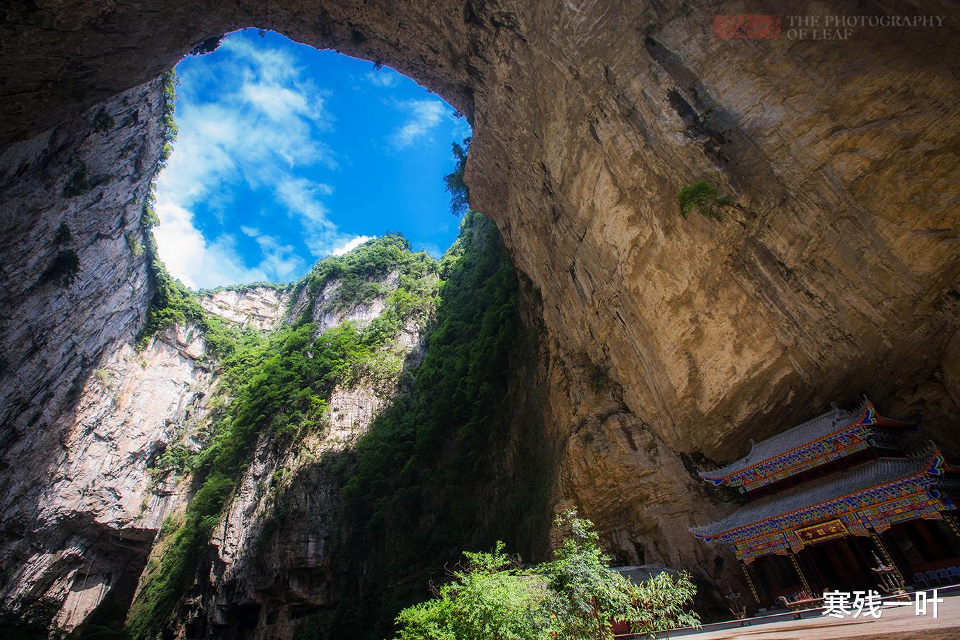 走过天生桥,眼出现了更为神奇的一幕,在桥与绝壁之间出现了一个超大的洞,整个洞呈一个圆形,仿佛是为峡谷底部开了一扇窗户,这就是景区另一个著名景点“天窗”。在天窗的底部还有一座寺庙名为:金穀寺,不过此寺只剩下一座牌楼,或许它原本就只有这些建筑。