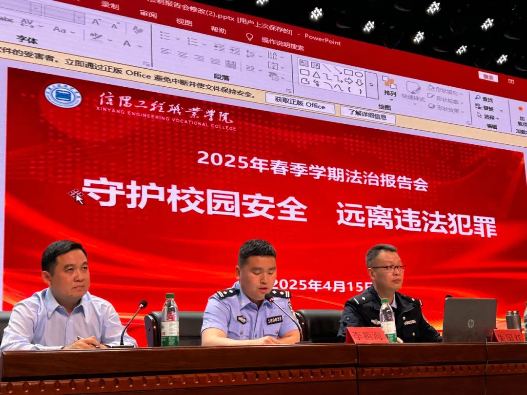 为筑牢校园安全防线,提升师生法治素养,4月15日下午,信阳工程职业学院特邀秀水派出所副所长李祖海、警官朱国红开展”守护校园安全·远离违法犯罪”主题法治教育报告会。学校法治副校长陶其文、学生处处长袁军、副处长张成武,各系辅导员及1000余名学生参加报告会,袁军主持报告会。