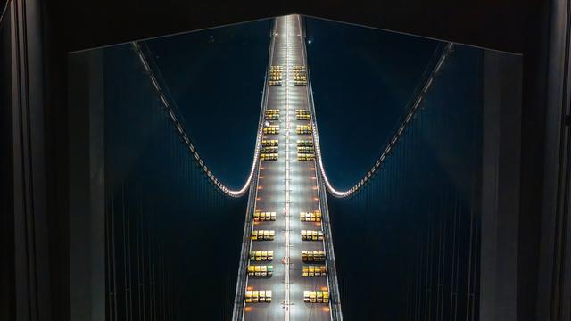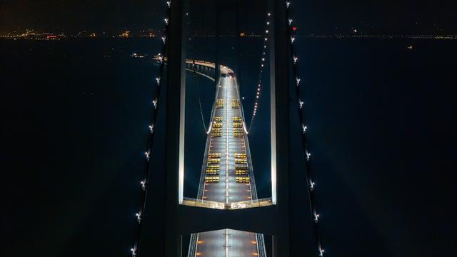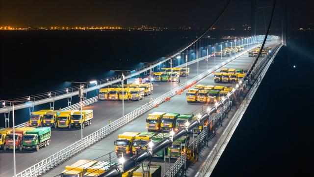 广东交通集团今日(18日)发布消息,昨晚(17日),经过136辆总重约5000吨的大货车组的载荷测试,深中通道伶仃洋大桥完成动静载试验,这是世界首次在全离岸海中超大跨径悬索桥上完成的荷载试验。