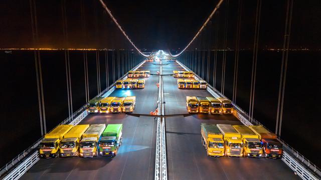 在动载无障碍行车试验中,工程师安排两辆满载共70吨、相当于约45辆小汽车重量的载重卡车,以每小时10至60公里不等的时速在大桥上匀速行驶。通过传感器,工程师测试结构在行车荷载作用下的动力反应,分析得到桥梁的冲击系数。