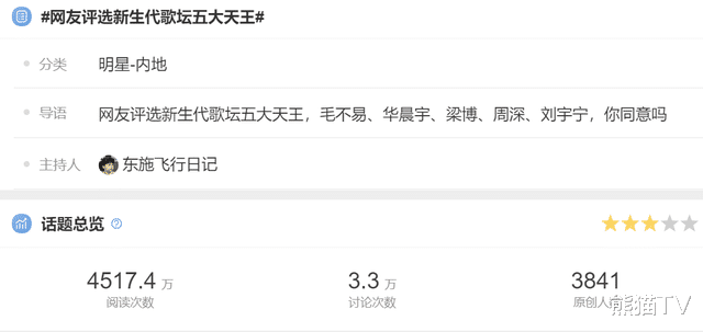 看点:2022年8月21日,“网友评选新生代歌坛五大天王”上热搜了,毛不易、华晨宇、梁博、周深、刘宇宁入选。网友纷纷调侃:不知道是哪个网友评的,也不知道在哪里评选,怎么突然就宣布结果了?