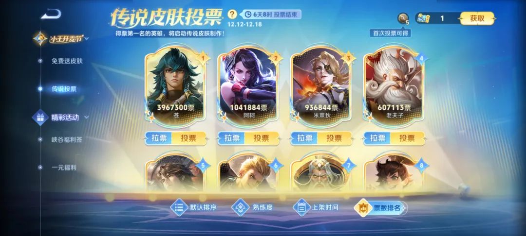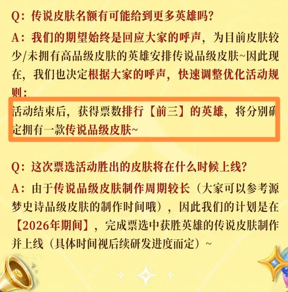 目前已经基本提前确定,成吉思汗将是这次投票的冠军,将获得一款传说皮肤。除此之外,最新消息显示,票数排名第二、第三的英雄,也将获得一款传说皮肤。