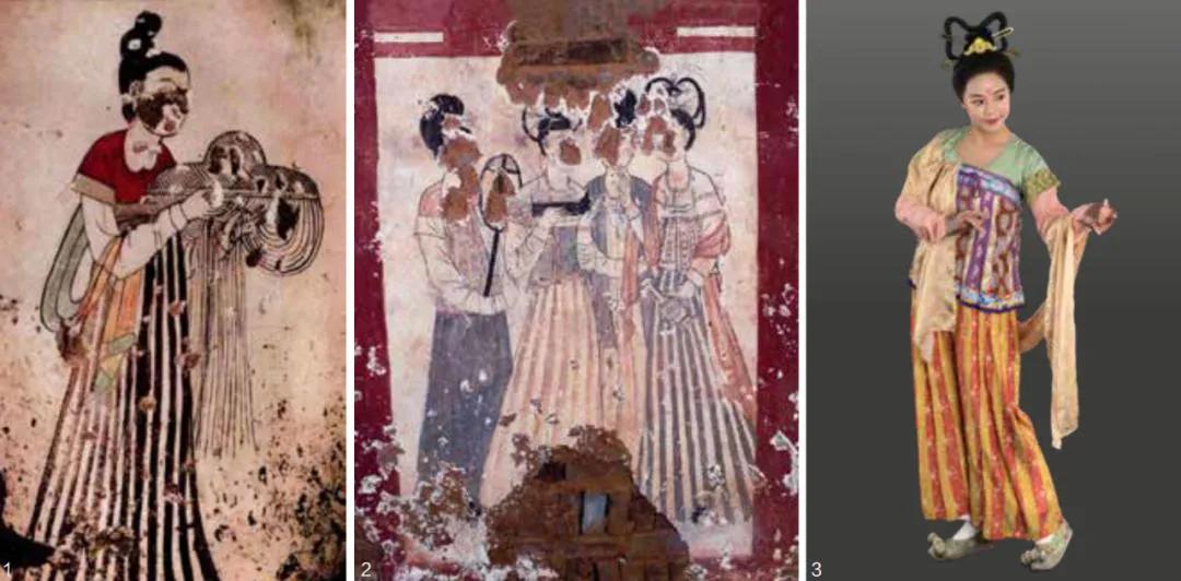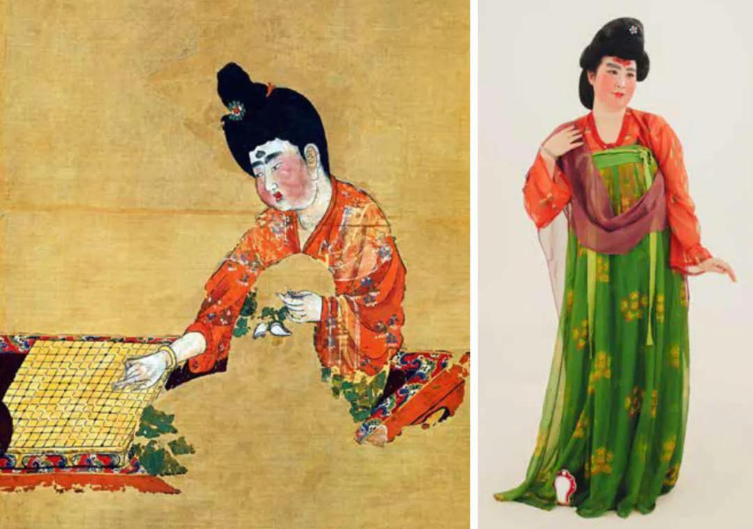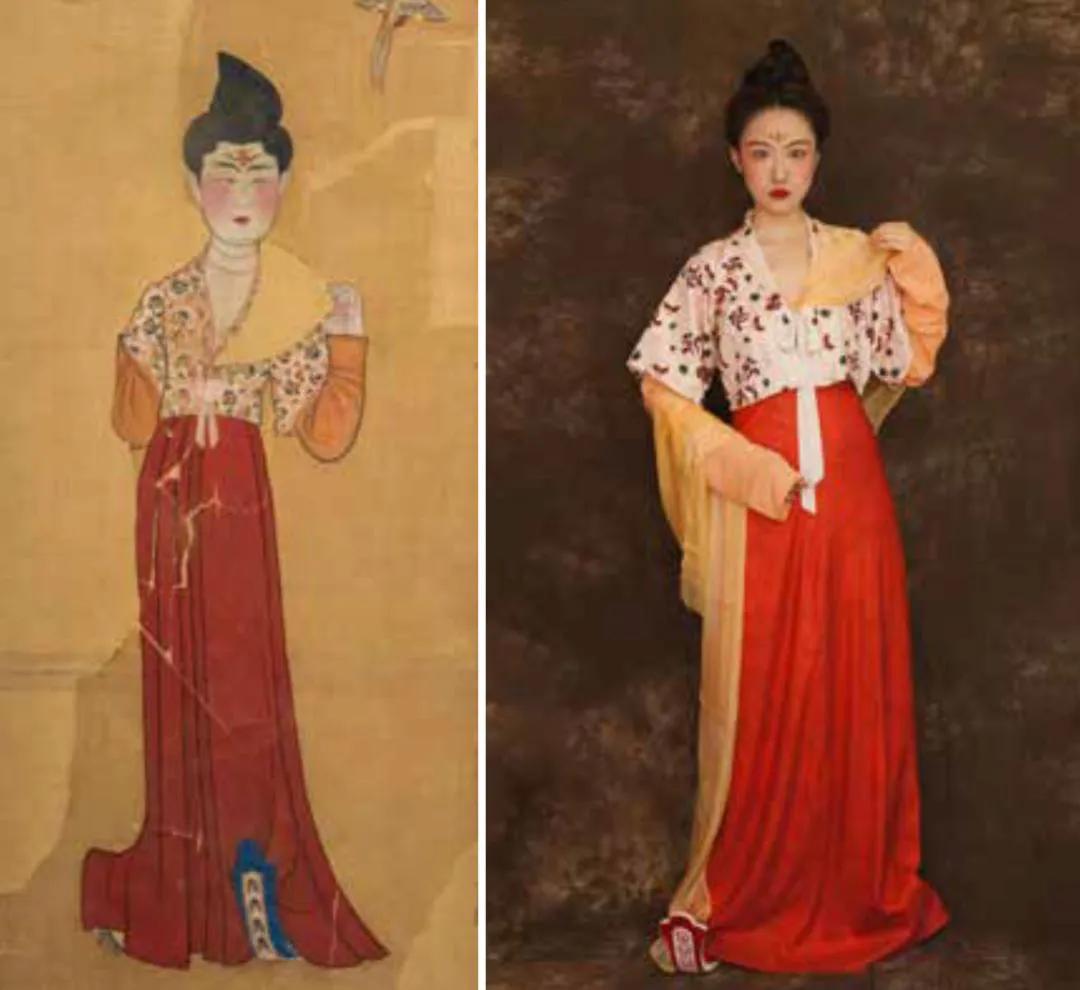 今天我们就来欣赏一些大唐的服饰吧。 图一:《都督夫人太原王氏礼佛图》(临摹)唐,敦煌莫高窟130窟壁画 图二:陕西礼泉昭陵陪葬墓燕妃墓壁画(局部) 图三:初唐时期女子的衫裙,根据新疆吐鲁番阿斯塔那墓出土人俑服饰复原 图四:昭陵段简璧墓出土壁画中身着白蓝色间裙的持扇女性 图五:唐代彩绘舞伎图,绢本,吐鲁番阿斯塔那230号张礼臣墓出土 图六:《弈棋仕女图》唐,1972年出土于新疆吐鲁番阿斯塔那187号墓的屏风画
