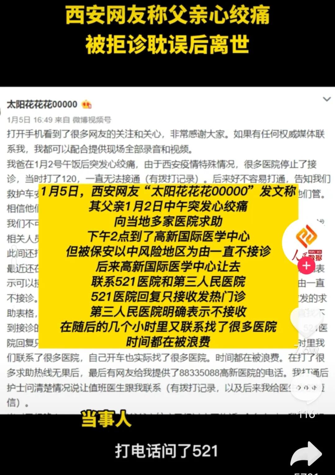 西安,真的让全国人民大失所望! 不知道医院之间相互踢皮球要干什么,前有医院不给孕妇住院导致怀孕八个月的孩子没了。 随后又爆出一位得了心绞痛的老人被多家医院拒诊,经过八个小时,最后错过抢救时间去世,就连女儿进医院见遗体也被保安拦下,还美曰其名,这是我们职业。 此外,在1月5号,还有一名孕妇因被医院拒绝接诊导致流产,这次还有民警护送都进不了医院的大门。 这就是西安执行的所谓的防疫措施,把人命当玩笑,医院只接受发热病人,垂危病人却拒之门外。 不知道这几家医院一共接收多少新冠患者,连三个人都没法治了? 也难怪,毕竟谁都不想承担责任,就用疫情,核酸等借口作为挡箭牌,来回踢皮球,真有意思!