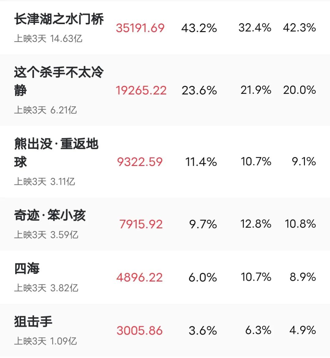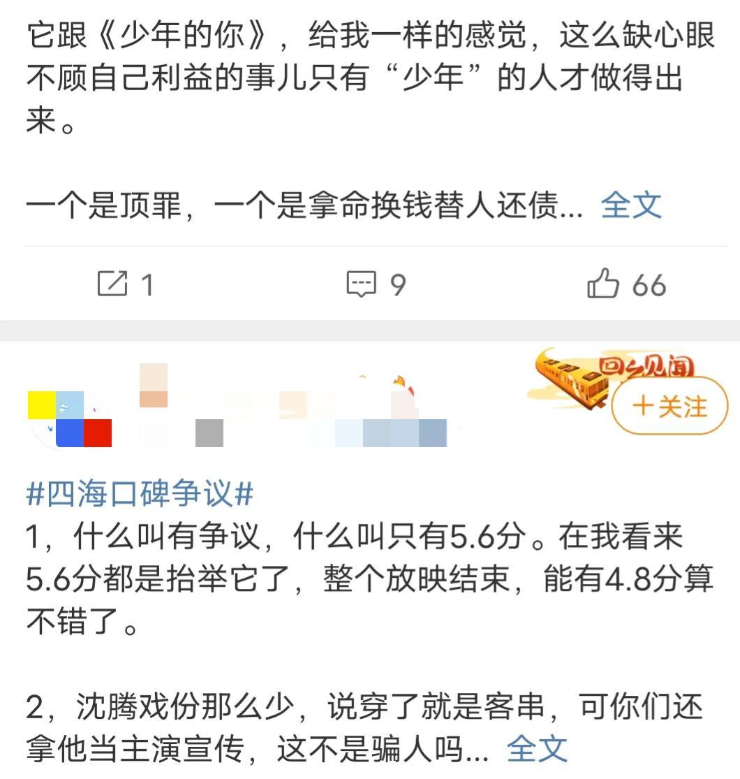 《四海》,恐怕要凉! 这几天,春节档电影票房竞争激烈,《水门桥》毫无悬念的3天就突破12亿票房。 而马丽主演的《这个杀手不太冷静》也逆袭排名第二,就连动画电影《熊出没》都有着不俗的成绩。 然而这里最尴尬的还要属电影《四海》,虽然电影质感的确不错,然而女主角选择了刘浩存,却让这样一部作品,口碑急剧下滑。 在韩寒近几年的作品中,扑街的电影可以说很少,然而今年却打错了如意算盘,剧情十分拉跨,评论区骂声一片。 沈腾,尹正,刘昊然都是好演员,另外配角里还有冯绍峰,黄晓明等人,依旧掩盖不住票房毒药的事实。 目前《四海》累计票房不到4亿,恐怕真的是要扑街了! 朋友们,你们怎么看?娱乐