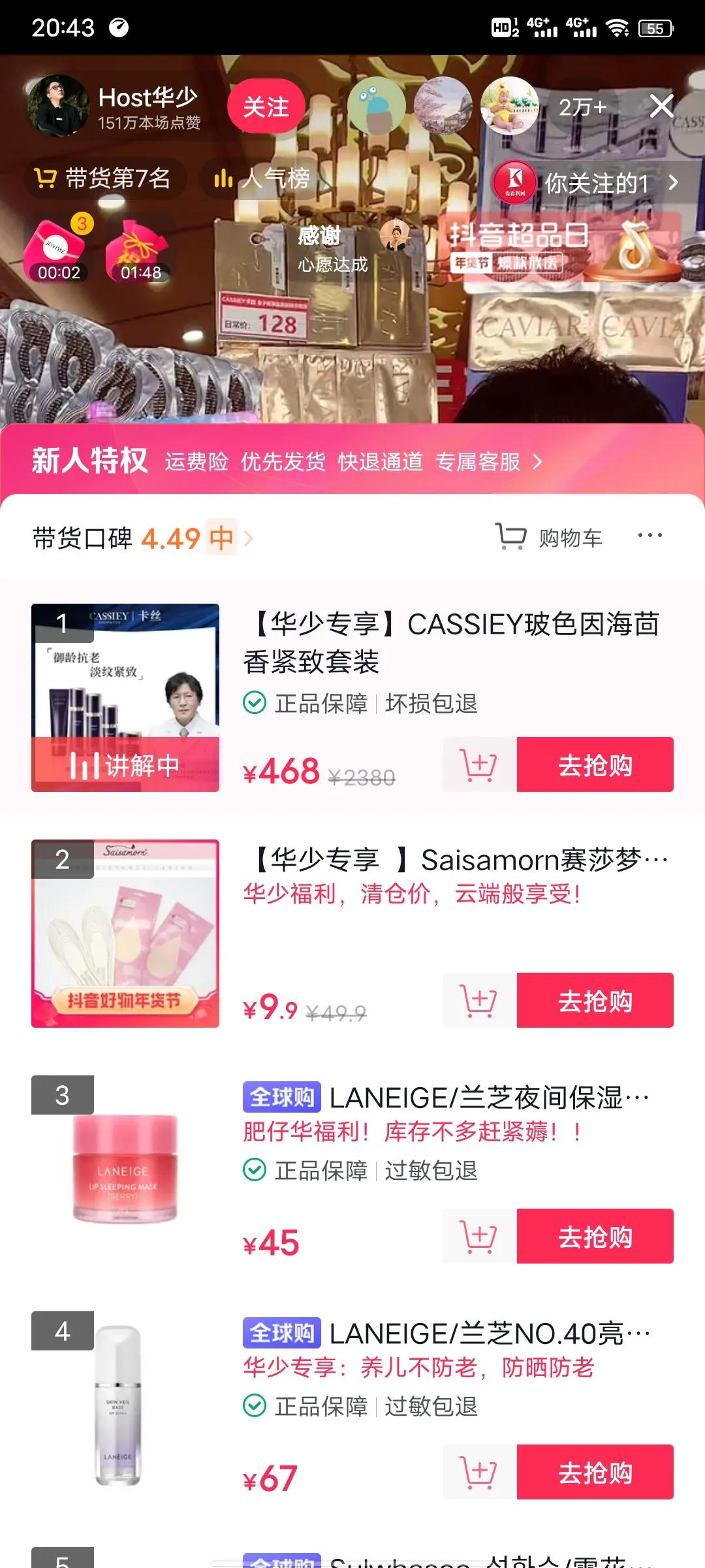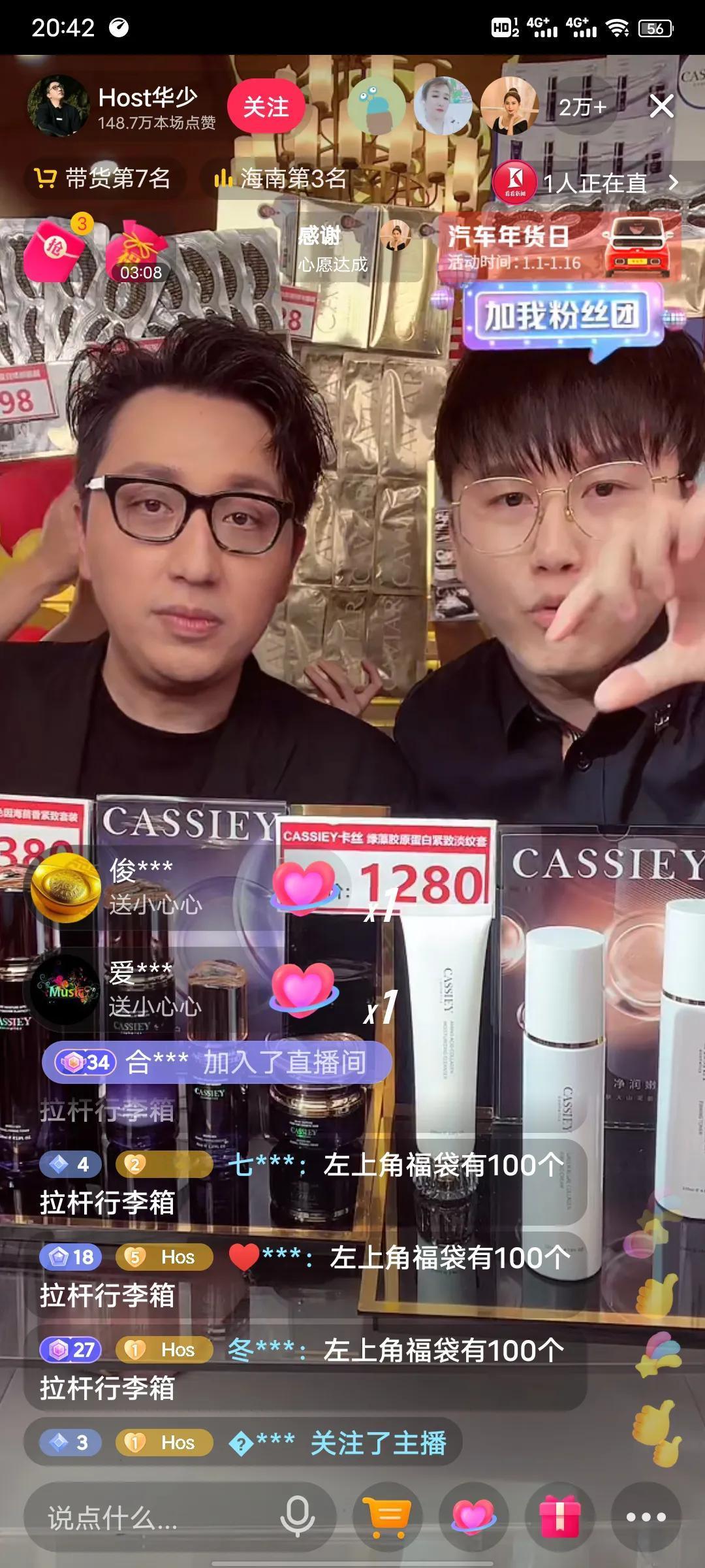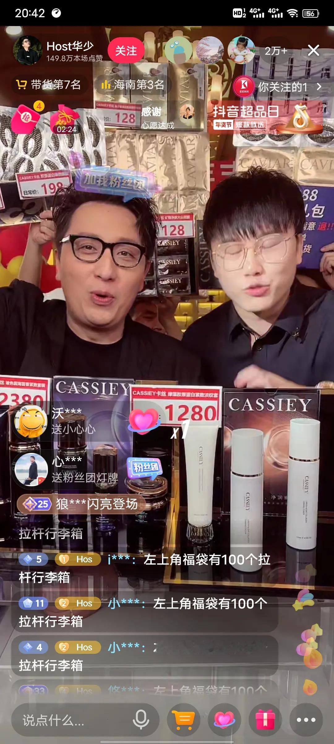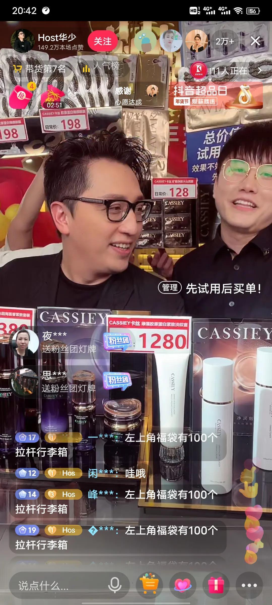 华少,这价格,谁敢买啊! 1月5日,华少在直播间带货一款化妆品,却因送的东西太多,导致网友直言不敢用。 直播间里,华少带货的两款产品,一个标价1280元,一个标价2380元,一旁的工作人员不断地在推销他们的产品,称今晚搞福利,买到就是赚到。 除了华少手里那款2380的化妆品套盒外,工作人员送的东西真的太多了,2个198的眼膜,2个128的面膜,还有1个288的保湿面膜。一共价值接近900元。 而这款2380的化妆品套盒原来价格是598,最后468就上了,有网友看到送这么多东西,吓得发了一句,送这么多,还敢用? 不得不说,华少这次带货送的东西太多了,把观众都给吓着了,但是谁能挡得住便宜的诱惑呢?直播间1000单很快就没了!