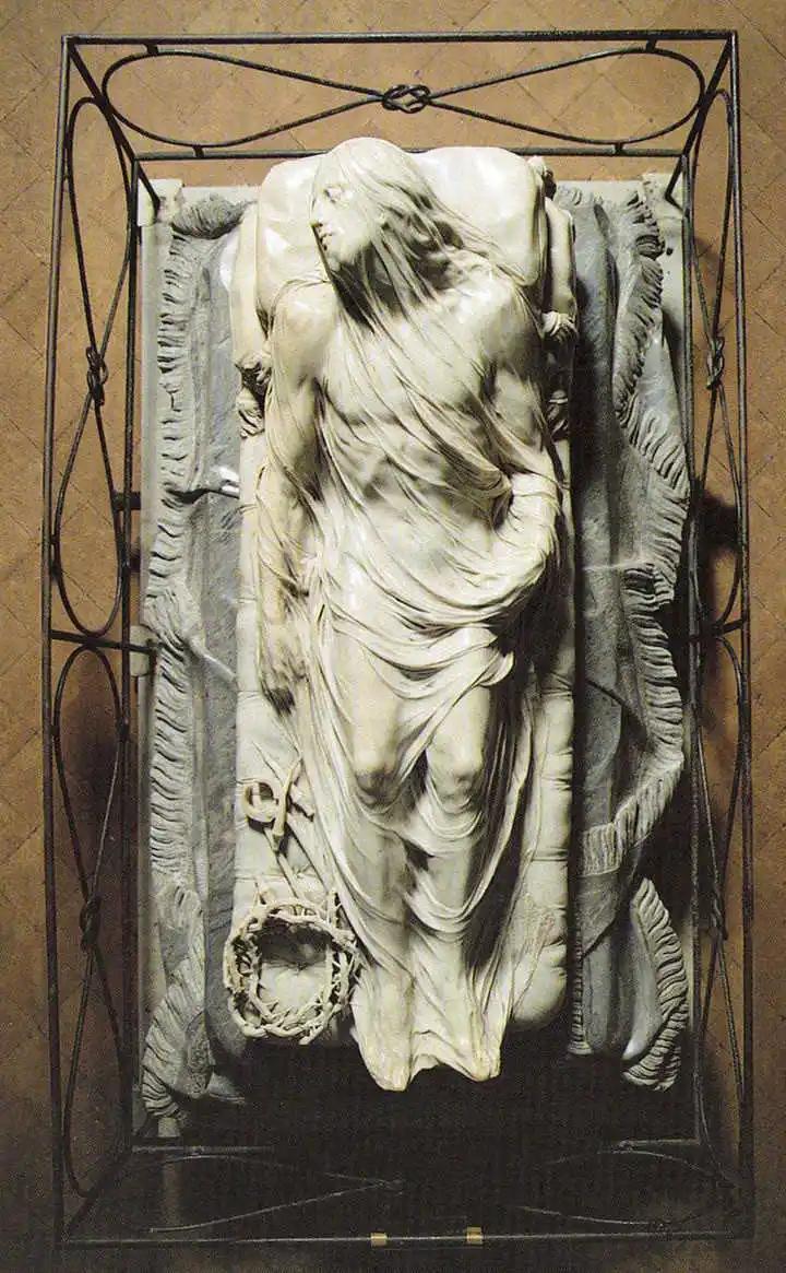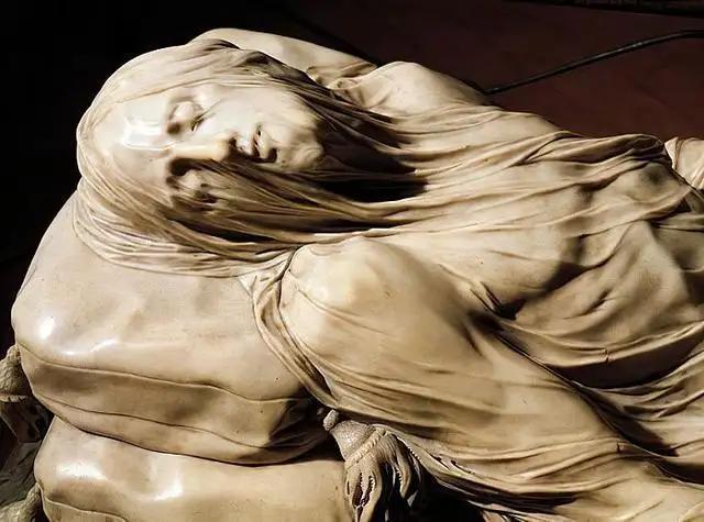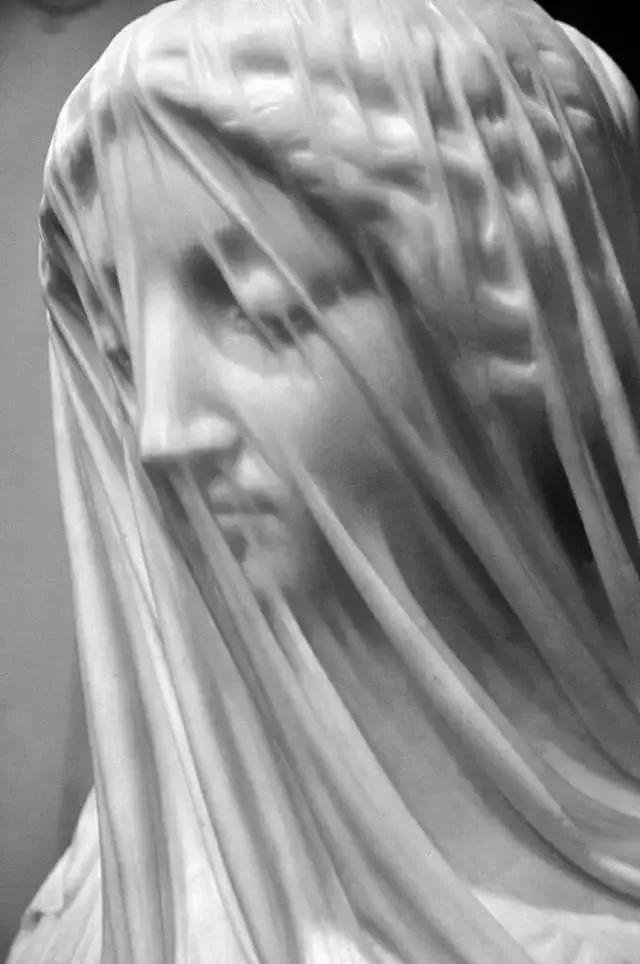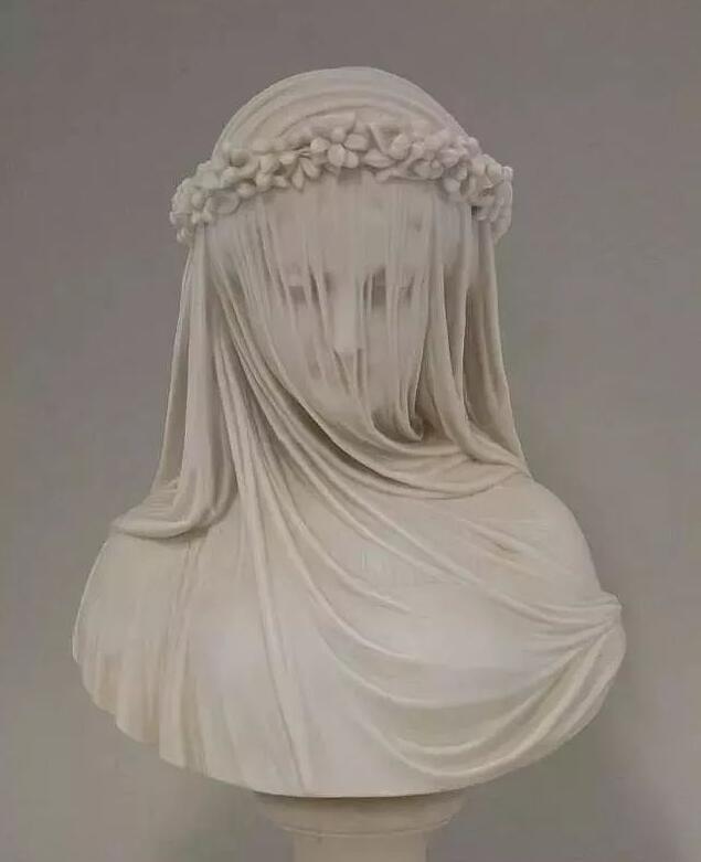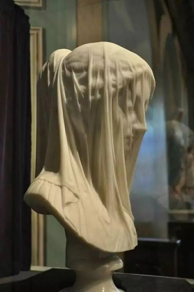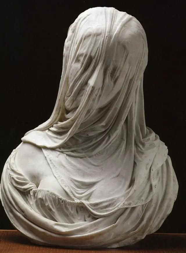18世纪的意大利,雕塑界兴起一种蒙纱技法,就是通过高超技艺在人物表面雕琢出层次分明的面纱。其中代表作品有乔瓦尼·斯特拉的《蒙着面纱的处女》(图1、2),安东尼奥·科拉第尼与朱塞佩·桑马蒂诺合作完成的《覆纱的基督》(图3、4)。 用坚硬厚重的大理石呈现面纱的柔软透亮,面纱薄若蝉翼,似与人物分离,宛如实物,我们甚至能够透过面纱看到后面人物的表情和躯体,栩栩如生,让人称奇。 图5-8为其他蒙纱雕塑代表作,同样震撼人心。
