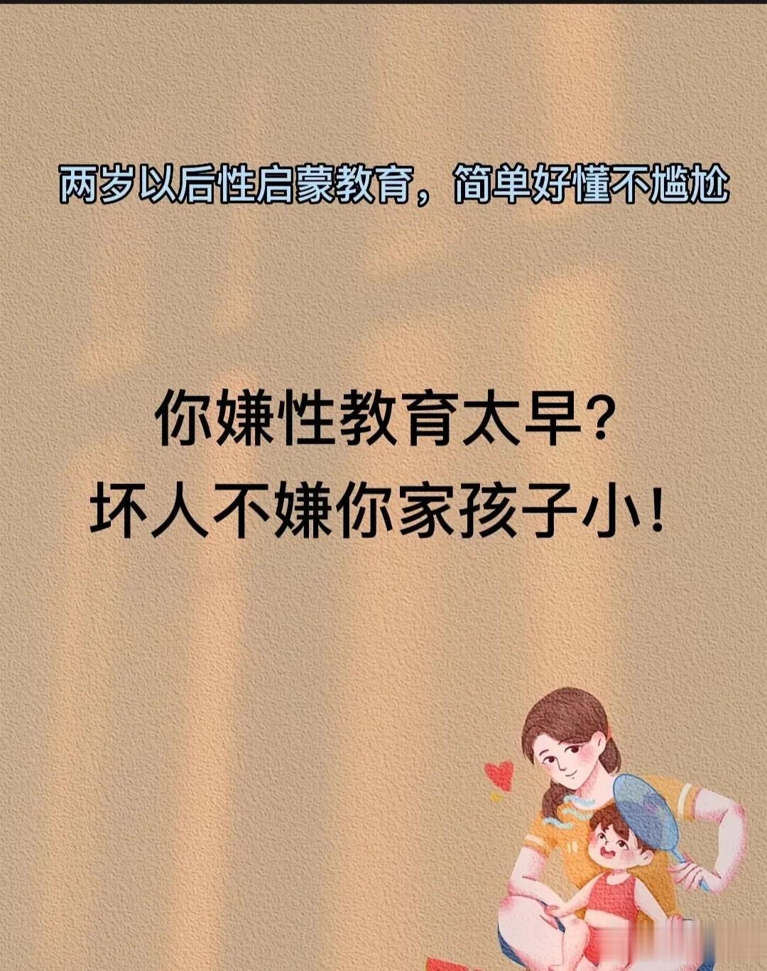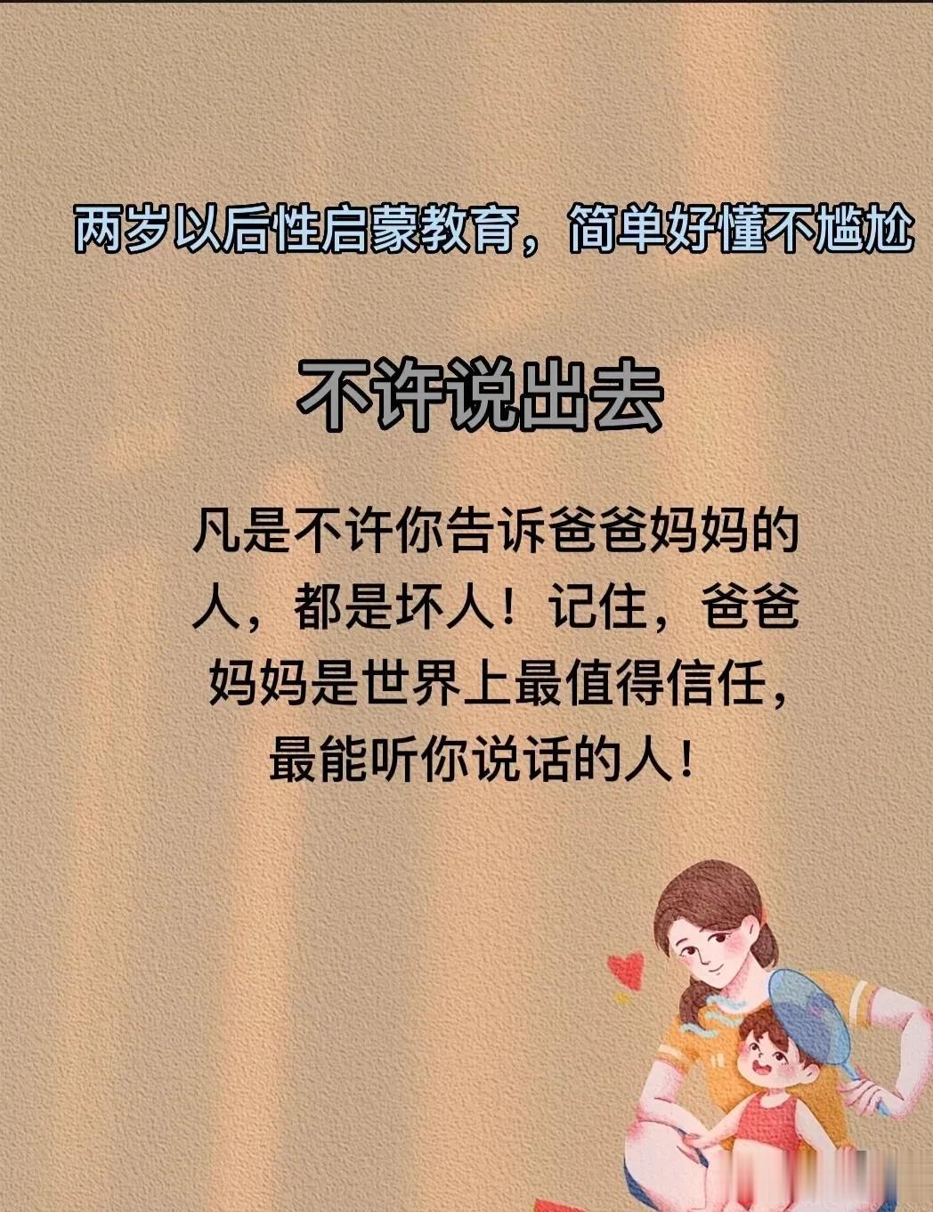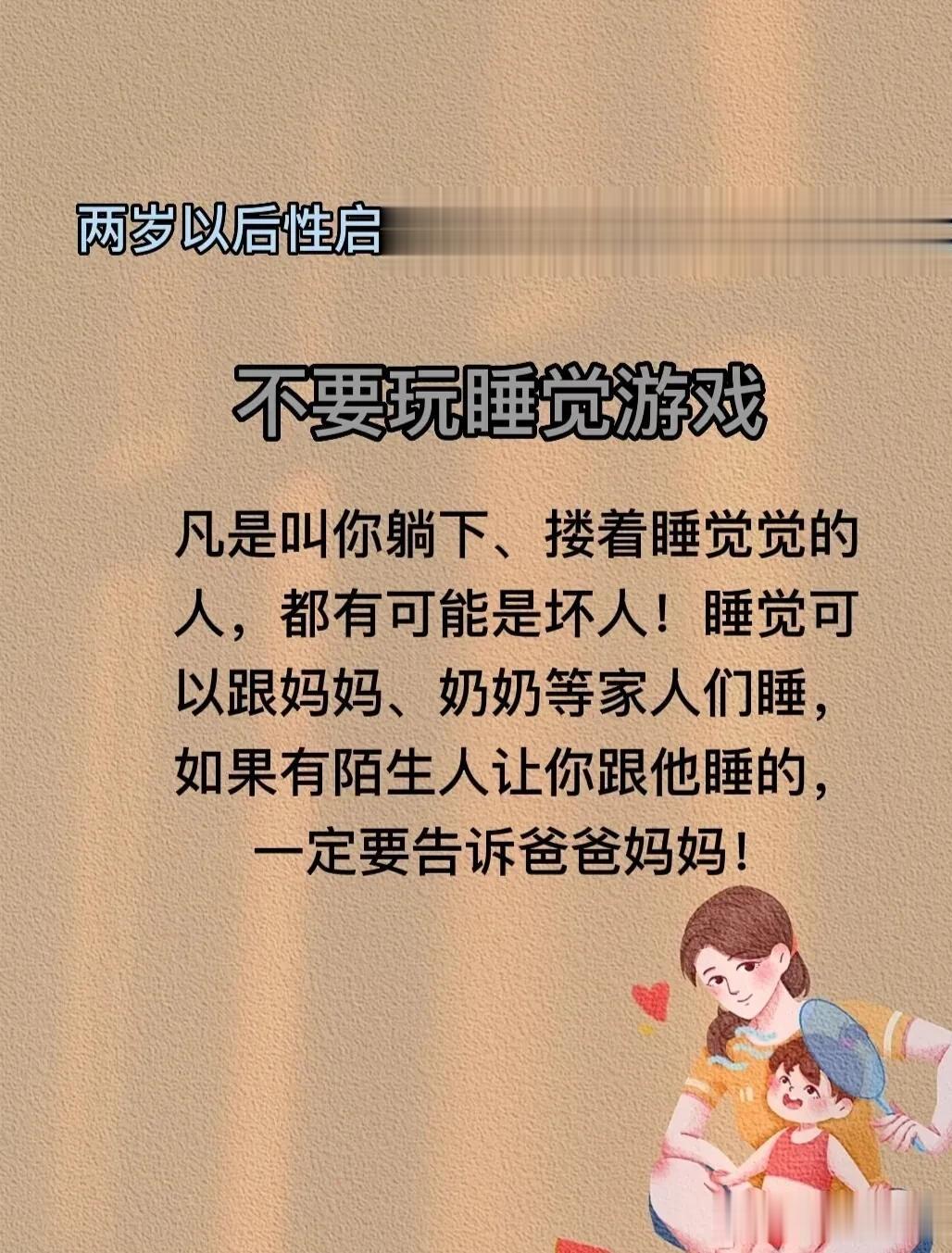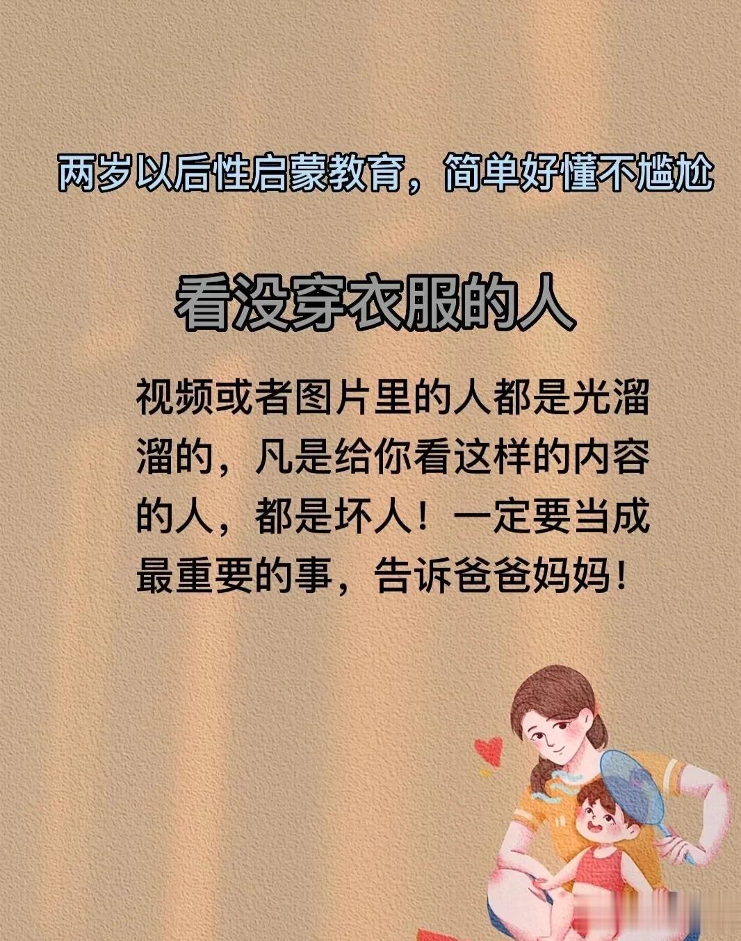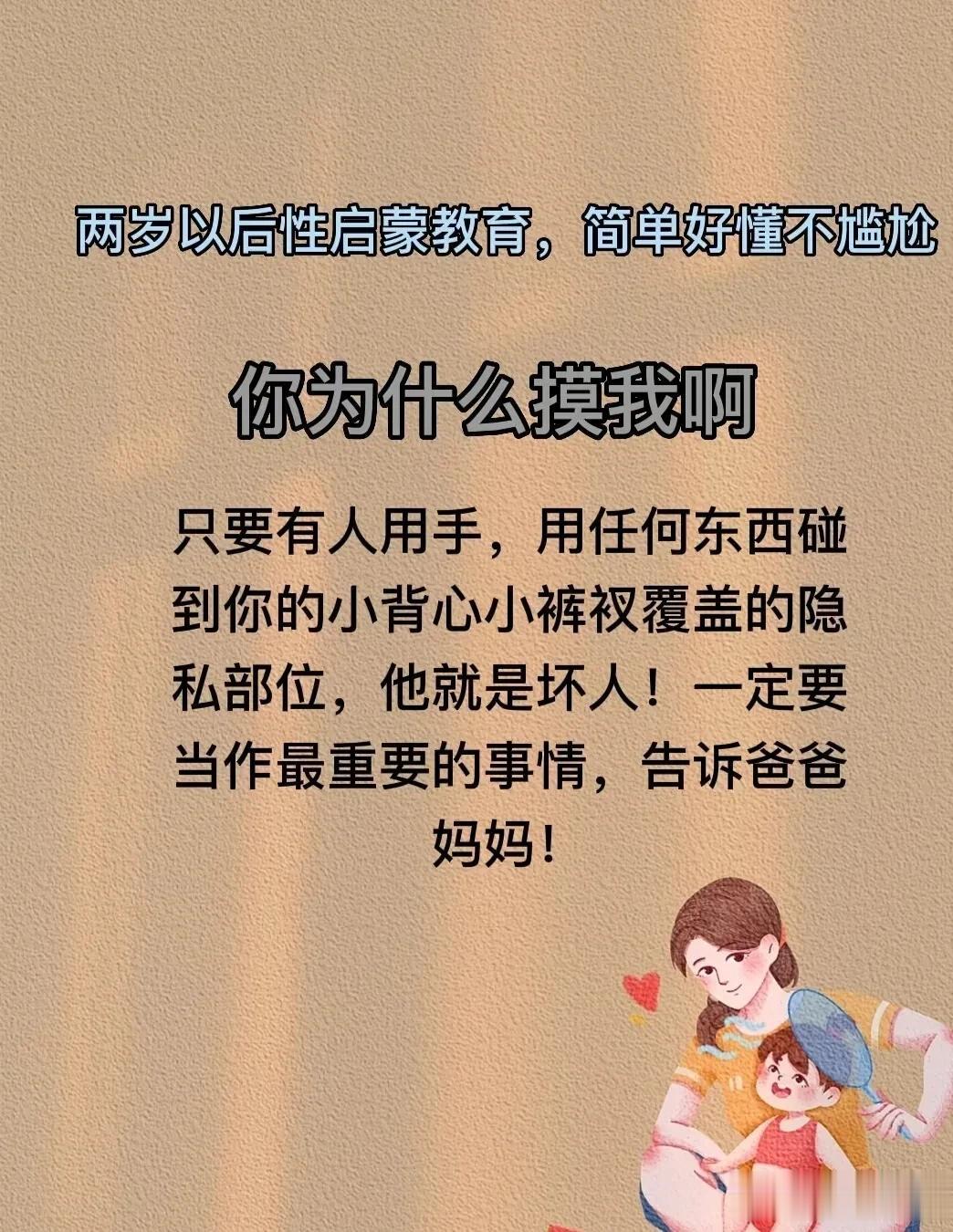 太可怕了,现在有很多关于性的新闻! 两岁之后,宝宝的性启蒙是非常重要的。 要牢记以下六点,特别是女宝宝,更要保护好。 1.凡是不许你不告诉爸爸妈妈的,都是坏人。 2.凡是要你玩睡觉觉游戏的陌生人都是坏人。 3.凡是给糖果让你脱衣服的陌生人都是坏人。 4.凡是用手触摸你裤衩覆盖的隐私部分的陌生人都是坏人。 5.凡是让你看没穿衣服的动画或者影视都是坏人。 6.凡是让你摸他的隐私部位的人都是坏人。 最后说一句。 你嫌性教育太早,坏人不会嫌你家孩子小。