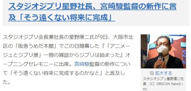 然而,2021年12月9日,吉卜力社长星野康二表示宫崎骏监督的新作《你想活出怎样的人生》即将完成,并预定于2023年上映,而这很有可能是“最后一次”。