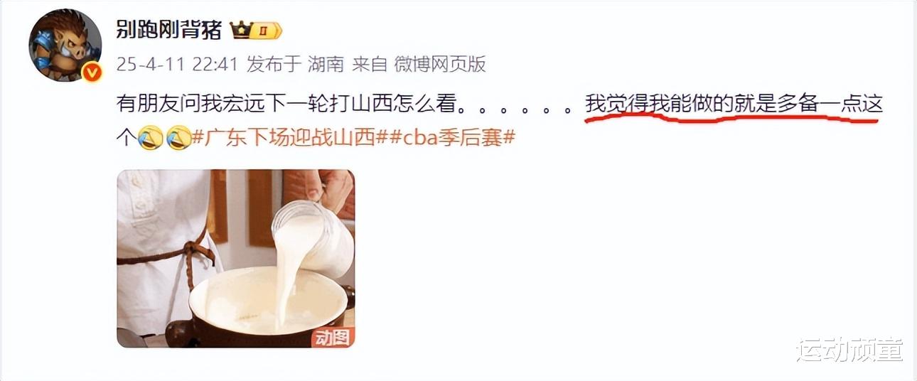 而别跑刚背猪被球迷问到如何看下一轮广东与山西时,他没有直接给出答案,而是晒出了一张喝牛奶的图片,并说道:我觉得我能做的就是多备一点这个。暗示这一轮比赛,谁吃的牛肉牛奶多,营养丰富,谁的身体强壮,也就是暗指谁的对抗能力强,拼劲足,谁就会占有优势。