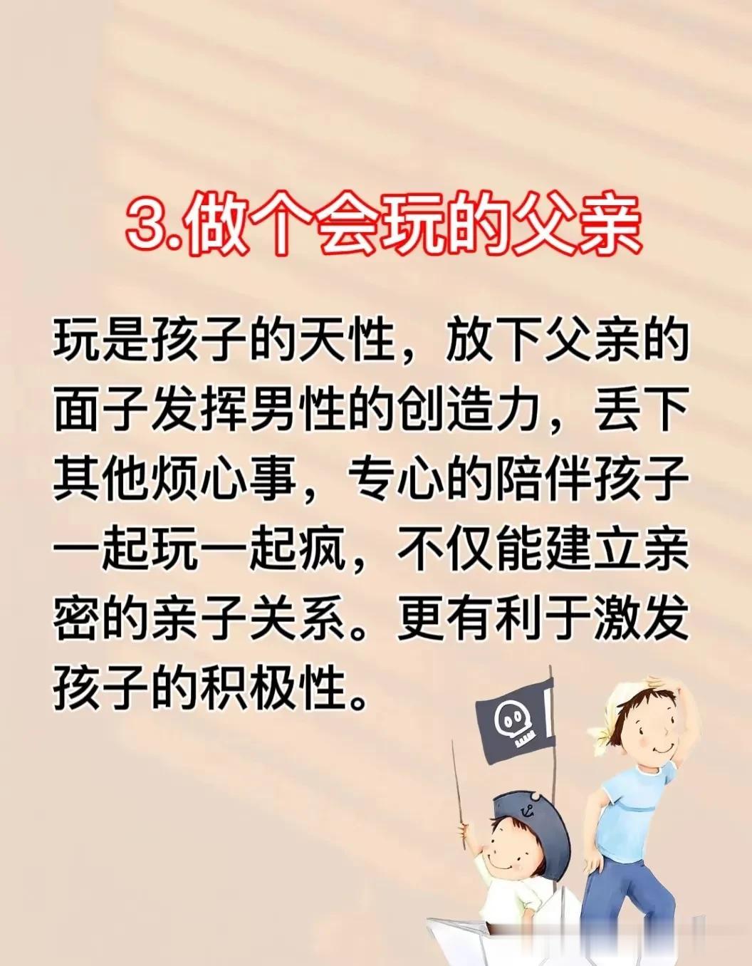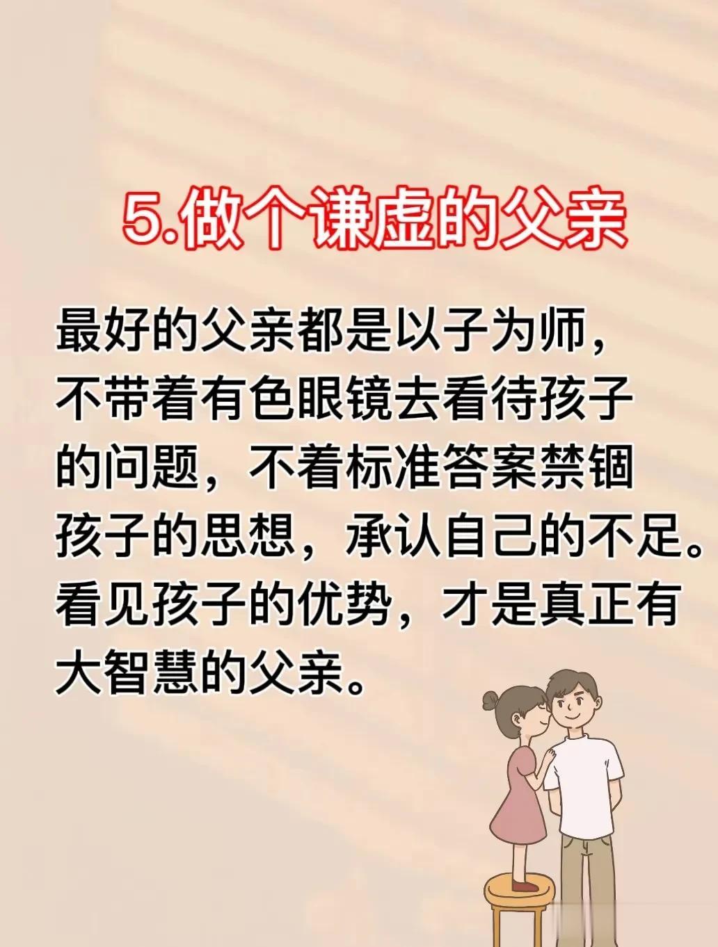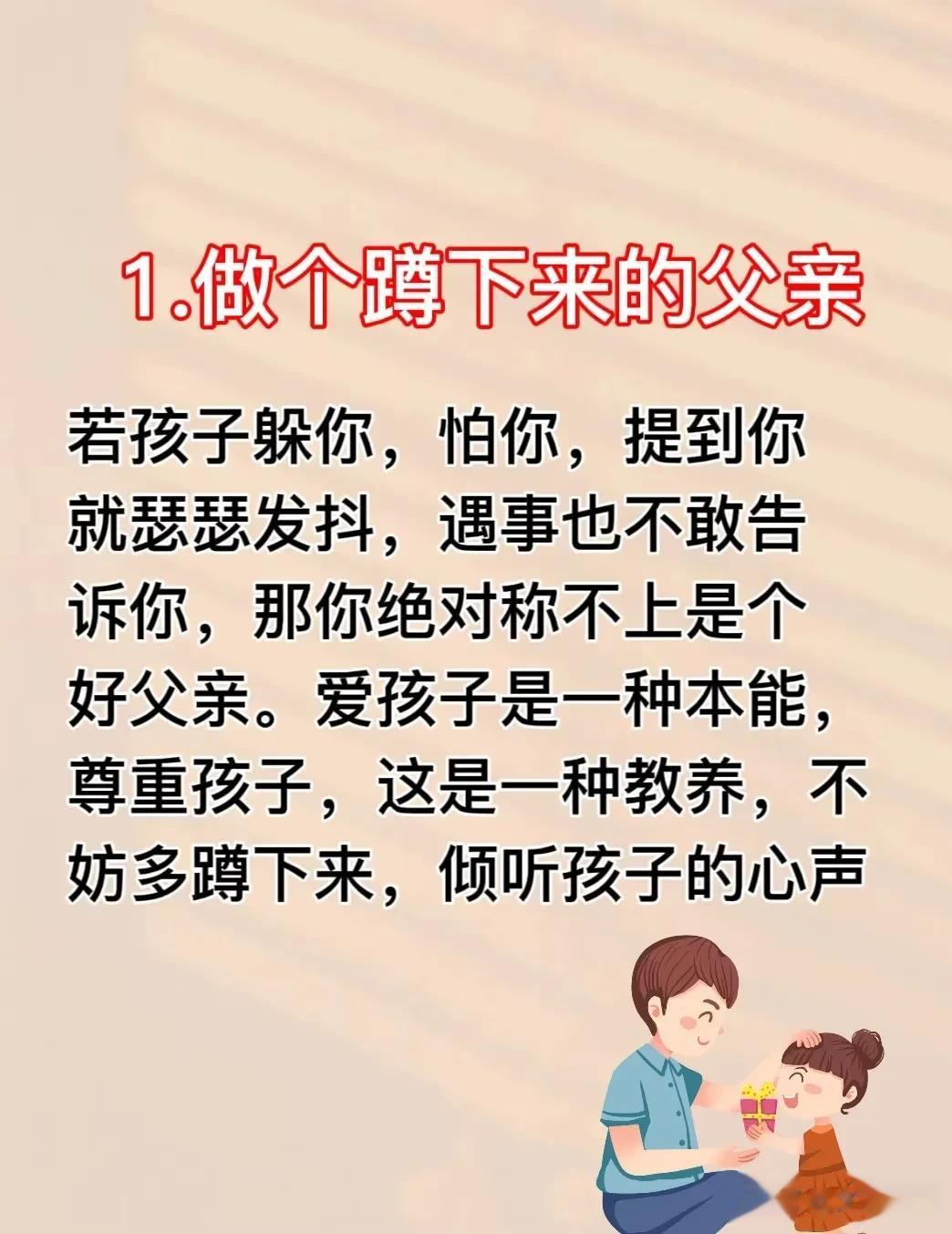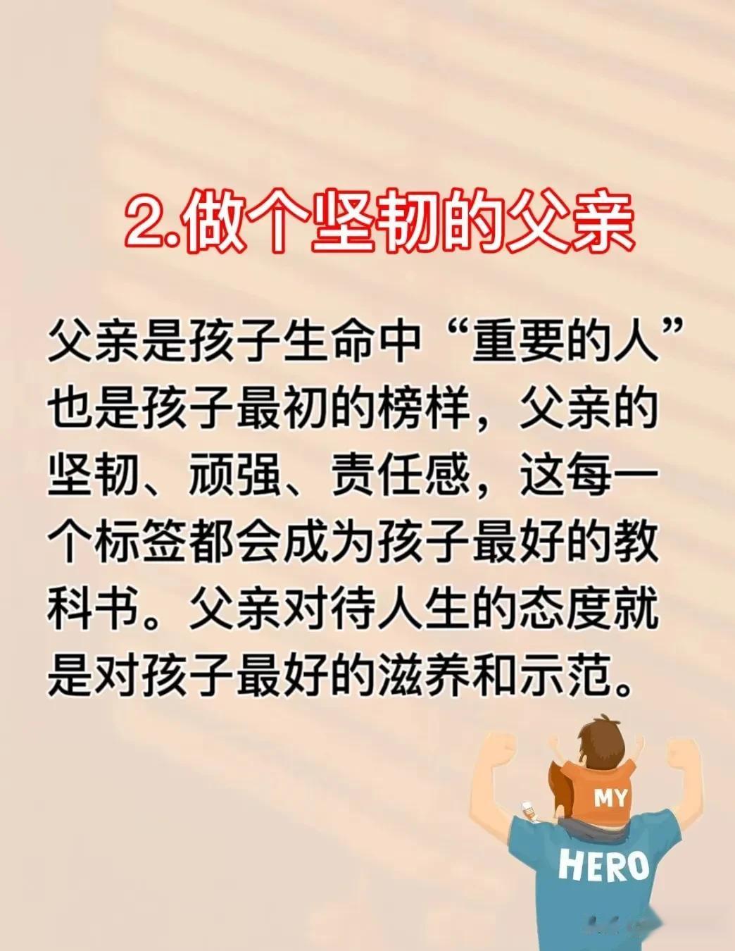 如何做一个合格的父亲? 1.做个蹲下来的父亲 若孩子躲你,怕你,提到你就瑟瑟发抖,遇事也不敢告诉你,那你绝对称不上是个好父亲。爱孩子是一种本能,尊重孩子,这是一种教养,不妨多蹲下来,倾听孩子的心声。 2.做个坚韧的父亲 父亲是孩子生命中"重要的人"也是孩子最初的榜样,父亲的坚韧、顽强、责任感,这每一个标签都会成为孩子最好的教科书。父亲对待人生的态度就是对孩子最好的滋养和示范。 3.做个会玩的父亲 玩是孩子的天性,放下父亲的面子发挥男性的创造力,丢下其他烦心事,专心的陪伴孩子一起玩一起疯,不仅能建立亲密的亲子关系。更有利于激发孩子的积极性。 4.做个善解人意的父亲 李玫瑾曾经强调过,父亲一要定要"慈"因为父亲慈爱,天塌下来,孩子认为是有人撑着,要 给孩子一种胸襟,告诉他这个眼前事,回头看看没什么大不了的,中国需要教育的不是孩子,而是爸爸平等表达,友善交流。 5.做个谦虚的父亲 最好的父亲都是以子为师,不带着有色眼镜去看待孩子的问题,不着标准答案禁锢孩子的思想,承认自己的不足。看见孩子的优势,才是真正有大智慧的父亲。 6.做个讲理的父亲好的父亲,都懂得循循善诱,让孩子明事理,分辨是非;好的教育都是在和善而坚定的气氛中,教会孩子做事做人的道理和准则。 7.做个不缺席的父亲 心理学家胡慎之说过:人生90%的短板来自父爱的缺席。请每一位爸爸务必重视孩子成长的重要时刻,让他感受到被爱被重视,孩子的生日请庆祝,孩子的表演请为他鼓掌,孩子的运动会请陪他去参加。 8.做个爱学习的父亲 一味要求孩子学习,自己从来不拿起书本,无形中成了典型的"坏"榜样。