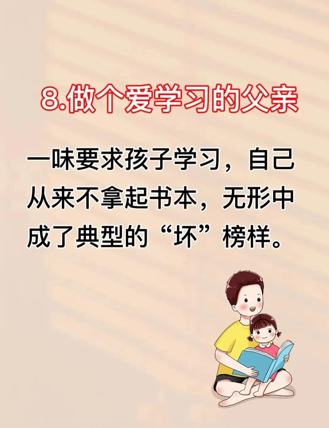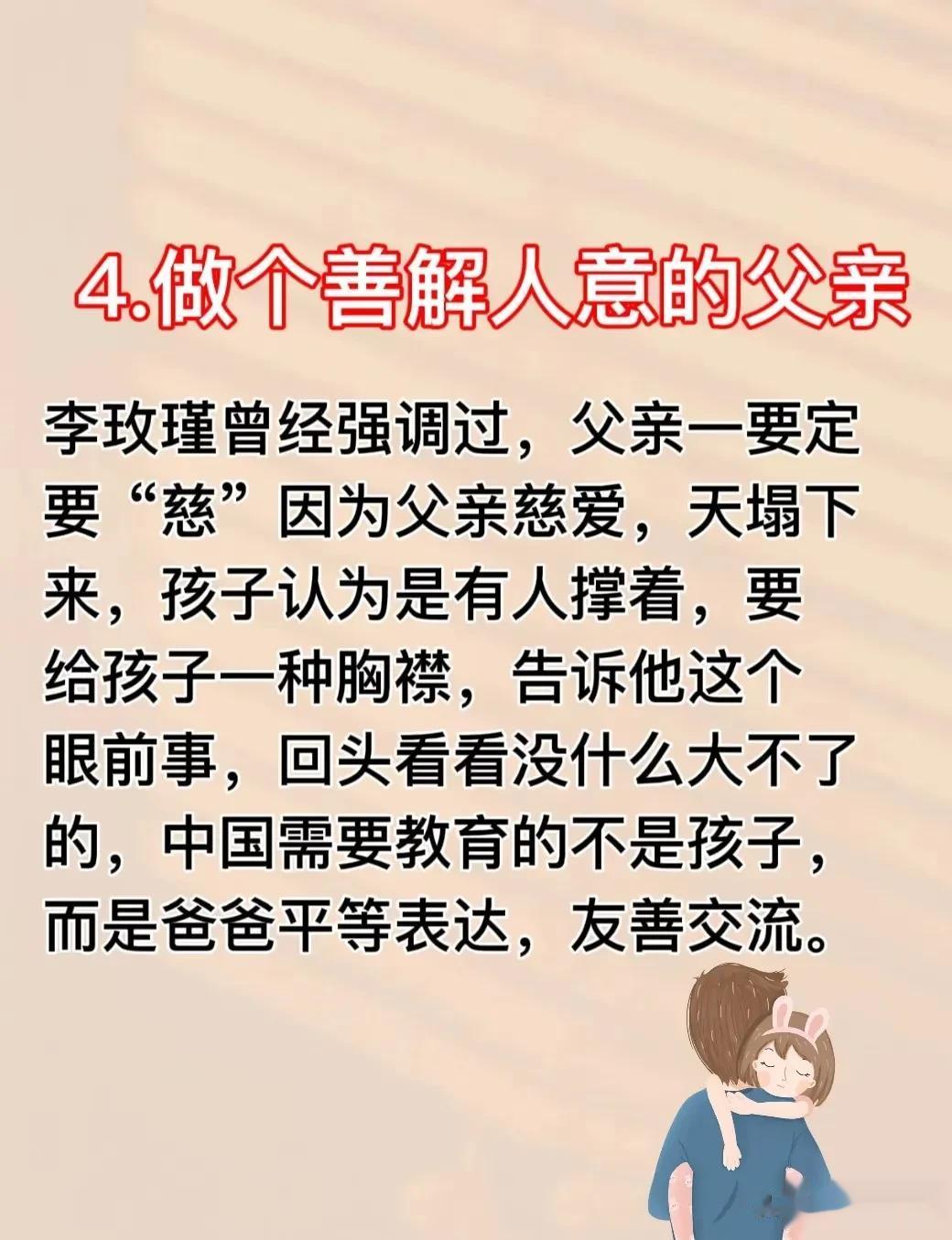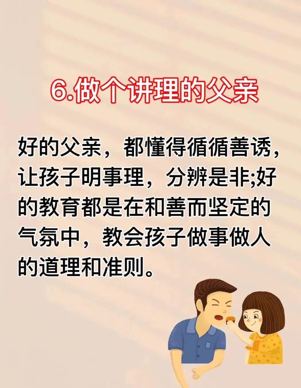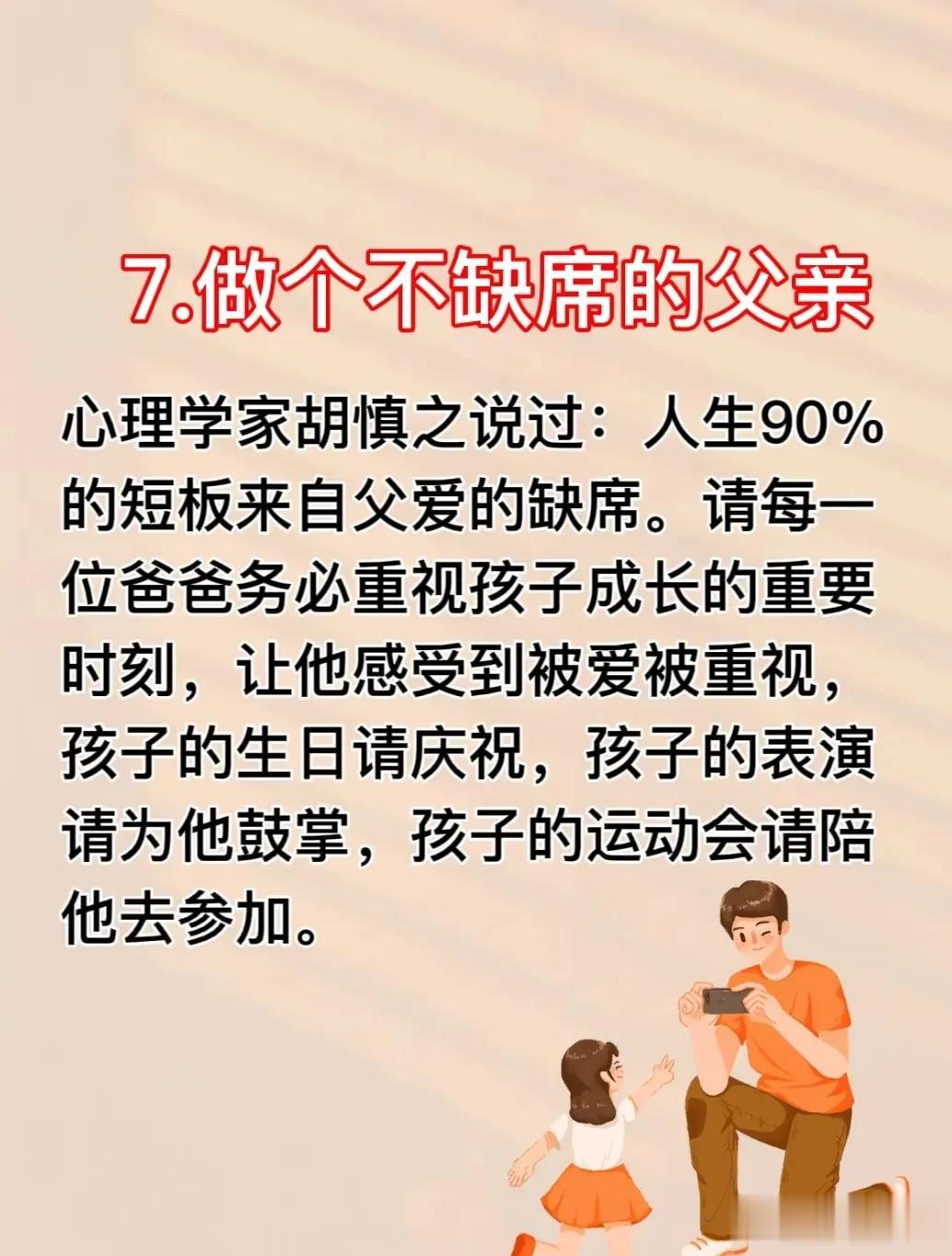 如何做一个合格的父亲? 1.做个蹲下来的父亲 若孩子躲你,怕你,提到你就瑟瑟发抖,遇事也不敢告诉你,那你绝对称不上是个好父亲。爱孩子是一种本能,尊重孩子,这是一种教养,不妨多蹲下来,倾听孩子的心声。 2.做个坚韧的父亲 父亲是孩子生命中"重要的人"也是孩子最初的榜样,父亲的坚韧、顽强、责任感,这每一个标签都会成为孩子最好的教科书。父亲对待人生的态度就是对孩子最好的滋养和示范。 3.做个会玩的父亲 玩是孩子的天性,放下父亲的面子发挥男性的创造力,丢下其他烦心事,专心的陪伴孩子一起玩一起疯,不仅能建立亲密的亲子关系。更有利于激发孩子的积极性。 4.做个善解人意的父亲 李玫瑾曾经强调过,父亲一要定要"慈"因为父亲慈爱,天塌下来,孩子认为是有人撑着,要 给孩子一种胸襟,告诉他这个眼前事,回头看看没什么大不了的,中国需要教育的不是孩子,而是爸爸平等表达,友善交流。 5.做个谦虚的父亲 最好的父亲都是以子为师,不带着有色眼镜去看待孩子的问题,不着标准答案禁锢孩子的思想,承认自己的不足。看见孩子的优势,才是真正有大智慧的父亲。 6.做个讲理的父亲好的父亲,都懂得循循善诱,让孩子明事理,分辨是非;好的教育都是在和善而坚定的气氛中,教会孩子做事做人的道理和准则。 7.做个不缺席的父亲 心理学家胡慎之说过:人生90%的短板来自父爱的缺席。请每一位爸爸务必重视孩子成长的重要时刻,让他感受到被爱被重视,孩子的生日请庆祝,孩子的表演请为他鼓掌,孩子的运动会请陪他去参加。 8.做个爱学习的父亲 一味要求孩子学习,自己从来不拿起书本,无形中成了典型的"坏"榜样。