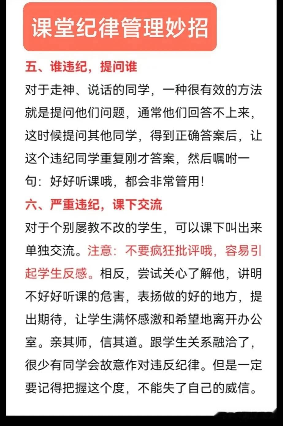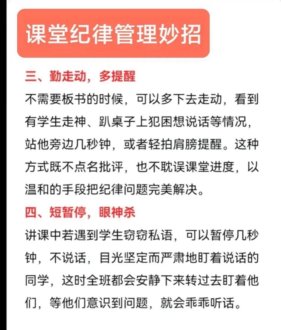 教师如何去管纪律?这是一个技术活。 课堂纪律管理妙招 一提要求,表态度 向学生提出具体要求,如不许交头接耳、吃东西、睡觉等。并表明自己对纪律的严厉态度,对违反课堂纪律的情况绝不忽视不管,否则学生会变本加厉,不把老师当回事儿,后期越来越难管。 二、小心机,多奖励 课前告诉同学们:今天如果大家课堂纪律很 好,我们留五分钟给大家放有意思的学科视 频,或者少留一项作业等,然后问同学们: 谁愿意配合?大家肯定齐刷刷举起手来。 三、勤走动,多提醒 不需要板书的时候,可以多下去走动,看到有学生走神、趴桌子上犯困想说话等情况,站他旁边几秒钟,或者轻拍肩膀提醒。这种方式既不点名批评,也不耽误课堂进度,以温和的手段把纪律问题完美解决。 四、短暂停,眼神杀 讲课中若遇到学生窃窃私语,可以暂停几秒 钟,不说话,目光坚定而严肃地盯着说话的 同学,这时全班都会安静下来转过去盯着他 们,等他们意识到问题,就会乖乖听话。 五、谁违纪,提问谁 对于走神、说话的同学,一种很有效的方法就是提问他们问题,通常他们回答不上来,这时候提问其他同学,得到正确答案后,让这个违纪同学重复刚才答案,然后嘱咐一句:好好听课哦,都会非常管用! 六、严重违纪,课下交流 对于个别屡教不改的学生,可以课下叫出来 单独交流。注意:不要疯狂批评哦,容易引 起学生反感。相反,尝试关心了解他,讲明 不好好听课的危害,表扬做的好的地方,提 出期待,让学生满怀感激和希望地离开办公 室。亲其师,信其道。跟学生关系融洽了, 很少有同学会故意作对违反纪律。但是一定 要记得把握这个度,不能失了自己的威信。 主要这六种方法,还有其他办法吗?