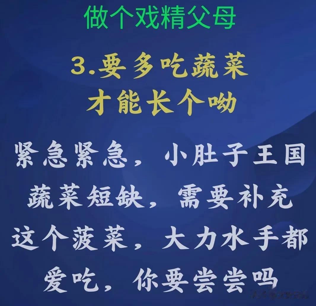做个戏精父母 1. 不能说妈妈累了,不能抱你了。 而要说妈妈牌机器人电量告急,请开启省电模式,妈妈好累呀,好想有人牵着走呢。 2. 不能说不刷牙会长虫哦。 而要说今天是宝宝坚持刷牙的777天,简直太酷了。 宝宝牙齿怎么这么白呀! 是怎么做的呀? 3. 不能说要多吃蔬菜才能长个呦。 而要说紧急紧急,小肚子王国,蔬菜短缺,需要补充。 这个菠菜,大力水手都爱吃,你要尝尝吗?