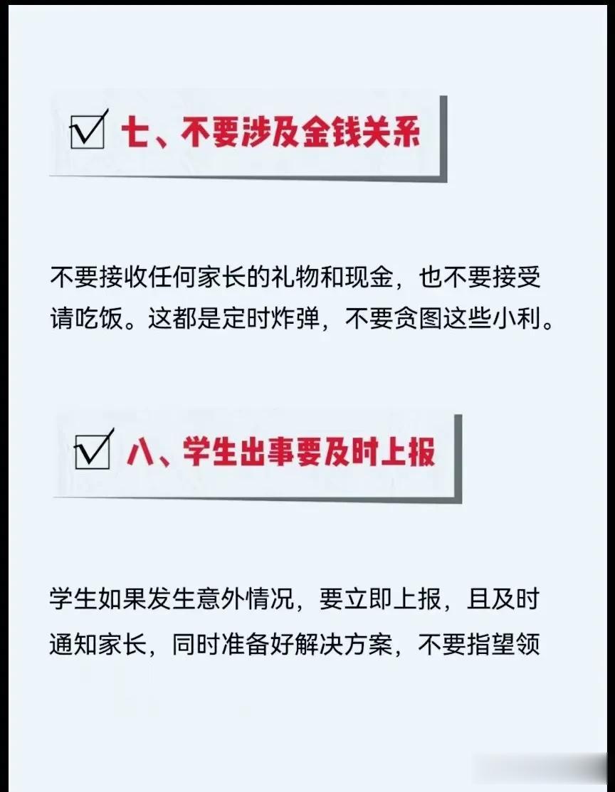 我看有些评论,还在责怪老师的,可以这么说,如果老师不按照以上准则做事,违反超过三条及以上,绝对不能善终,现在主要是家长难办,他希望你跪着教他孩子,你只要敢管他就敢举报,举报到你不干为止