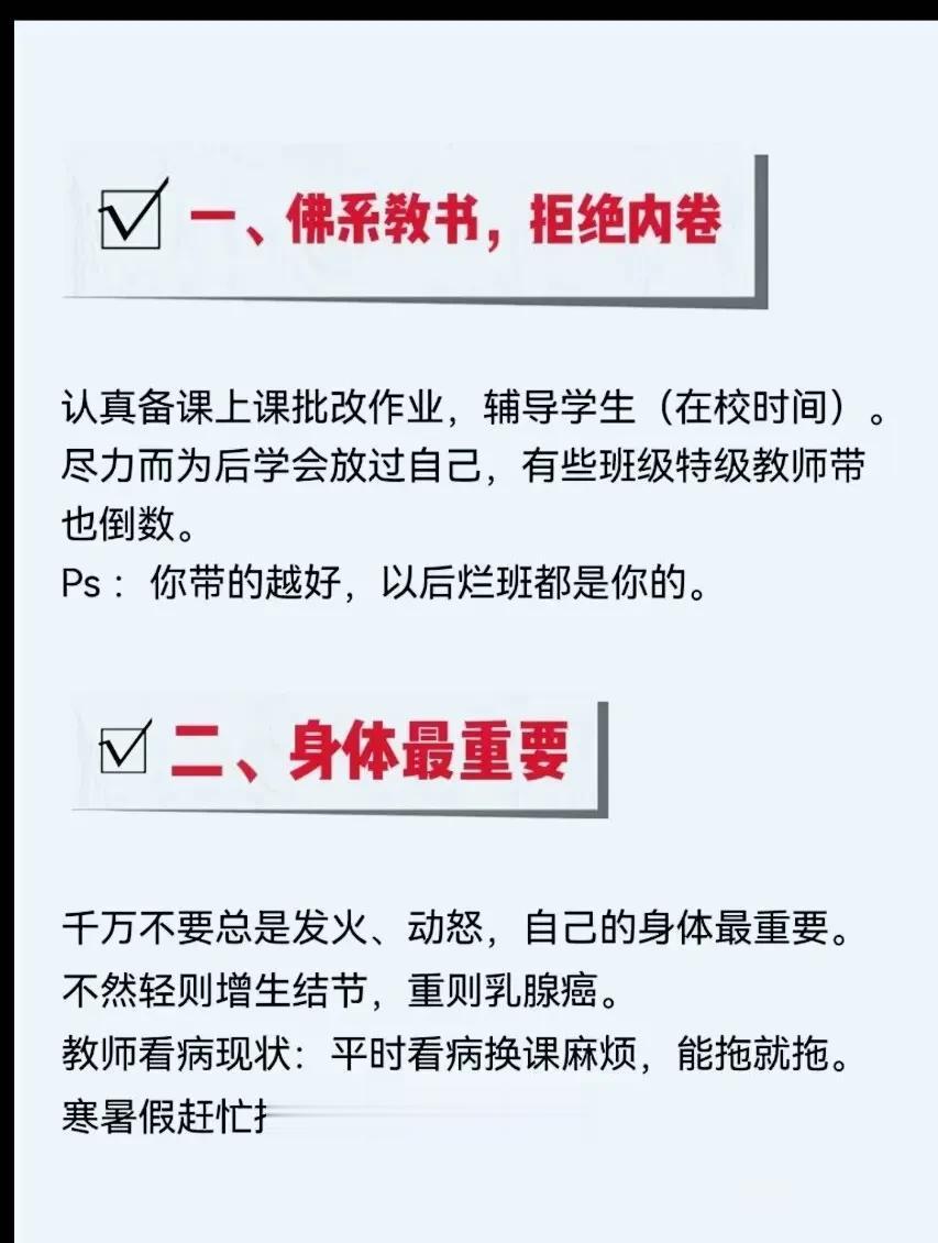 教师十大保命法则: 1.佛系教书,拒绝内卷。 2.身体最重要。 3.绝对不能打学生。 4.不要试图改变任何人。 5.工作和生活分离。 6.工作沟通要留好证据。 7.不要涉及金钱关系。 8.学生出事要及时上报。 9.不要动不动就找家长。 10.不要奖励学生食物。 还有哪些保命法则,欢迎来贡献一些。