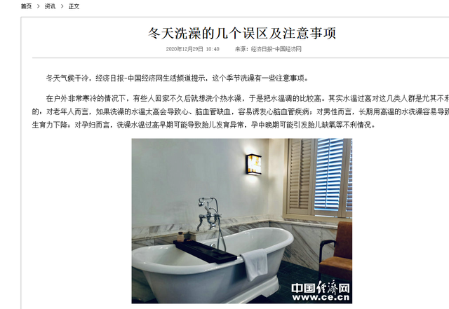 中国经济网:2020-12-29《冬天洗澡的几个误区及注意事项》