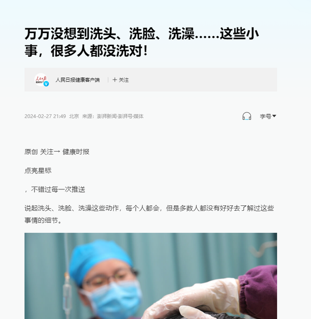参考资料:人民日报:2024-02-27《万万没想到洗头、洗脸、洗澡....这些小事,很多人都没洗对!》