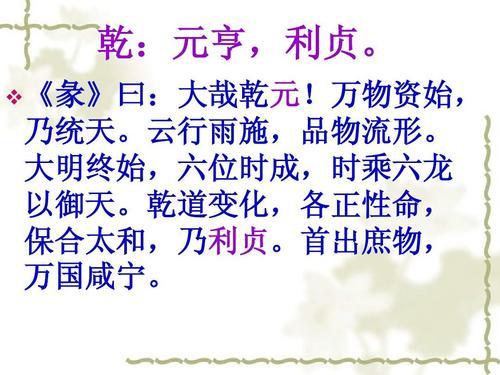 判断曰:伟大啊!乾所充当的天被列在《易经》全篇的首位,是宇宙间一切物类依托的根本,并且统率着气候变化。雨云随风运行甘霖散布大地,众多物种生长变化形成新的形体,日月周而复始地运行,风、火、署、湿、燥、寒六气各居其位季节形成,季节轮流是六气交替及龙星运行在驾驭着气候轮替。天气按规律变化,万物各自正常按其特点生存,保持和谐融洽的太平盛世,并且人们耕种的意志坚定,确切地表明会生产出众多物产,天下和睦安宁。