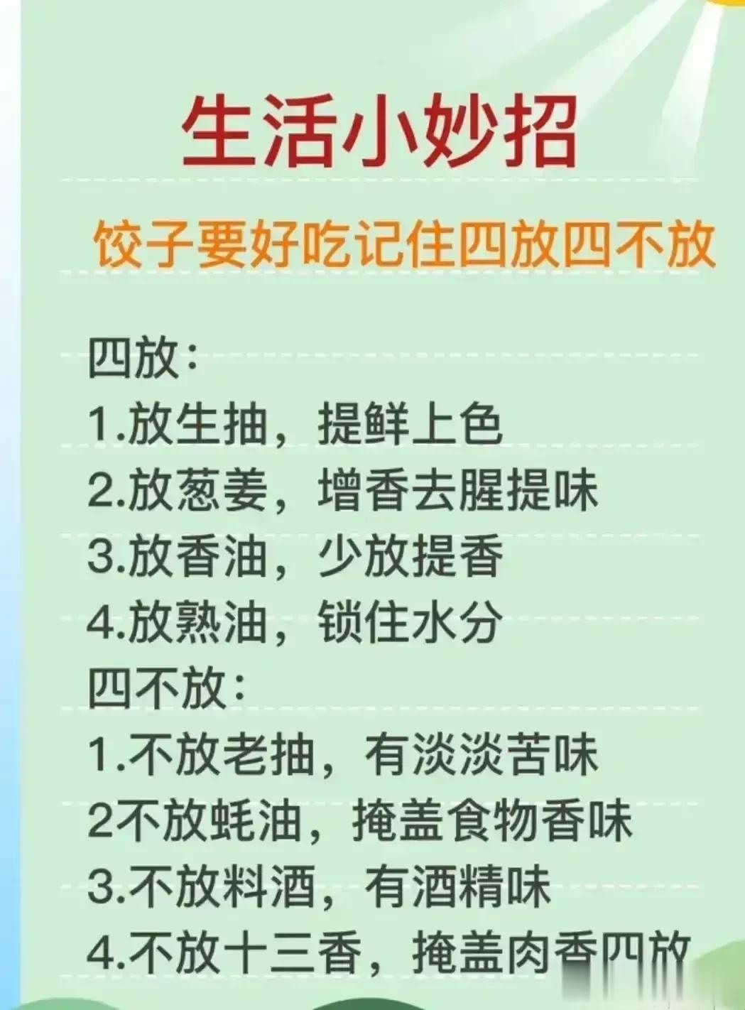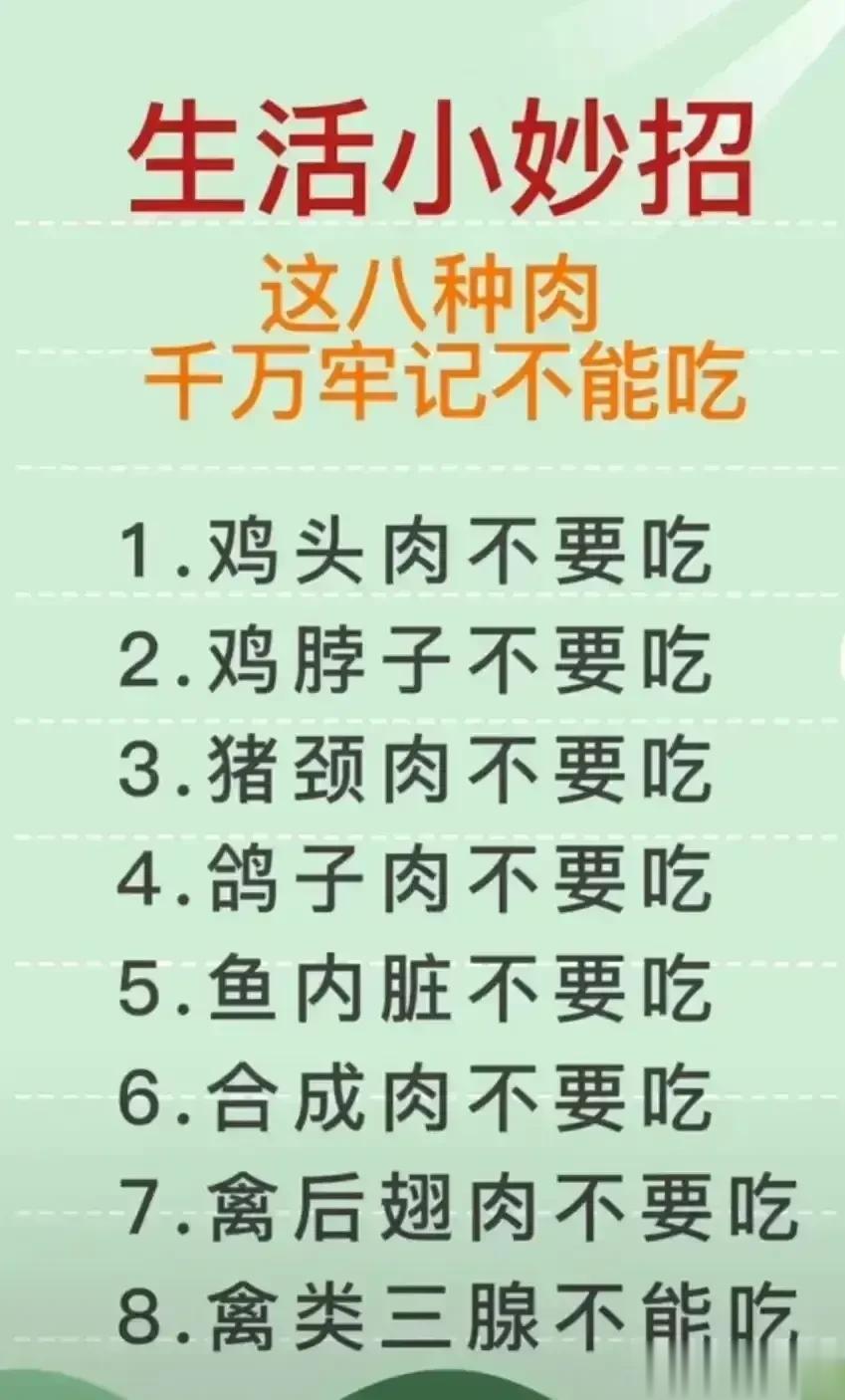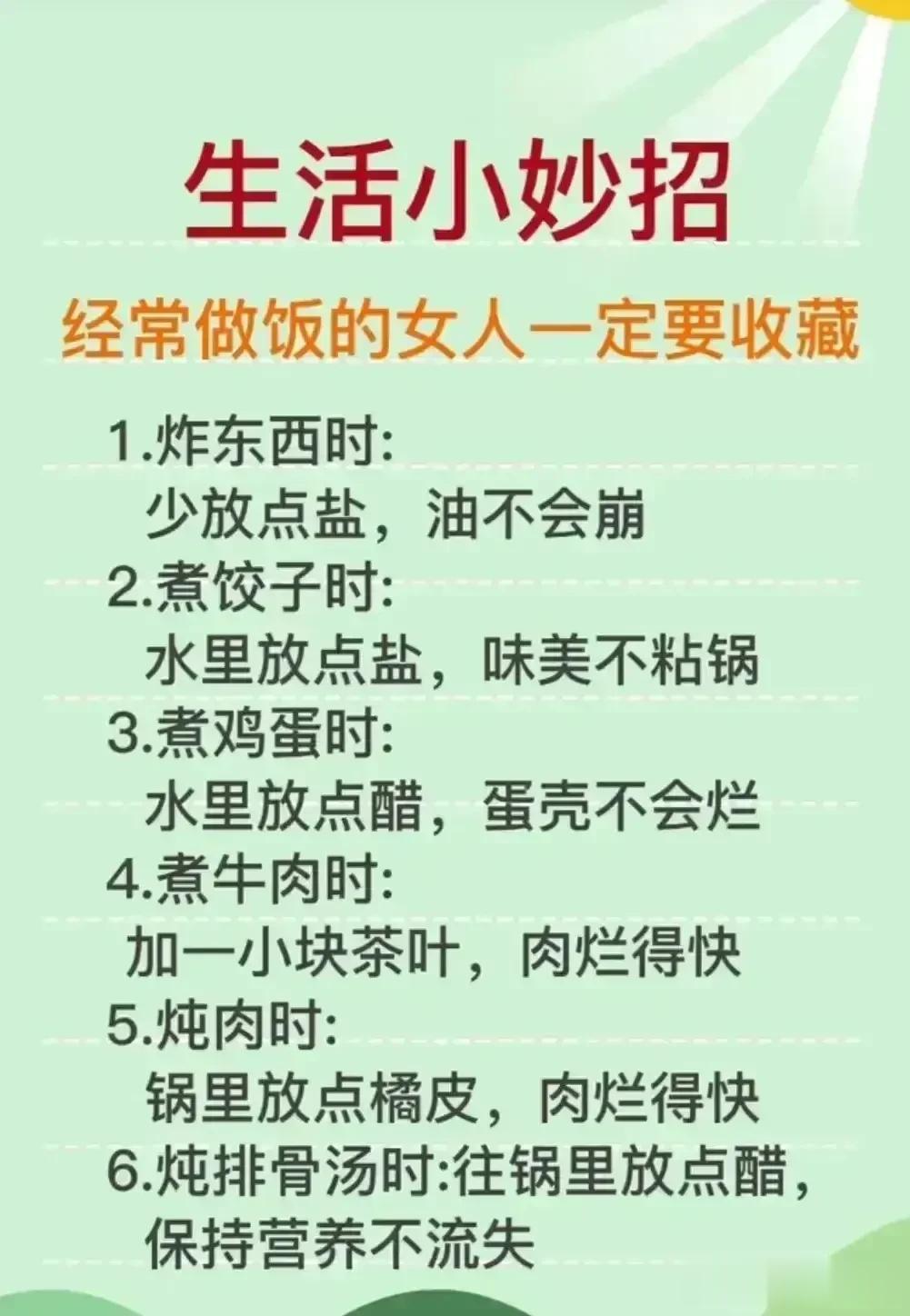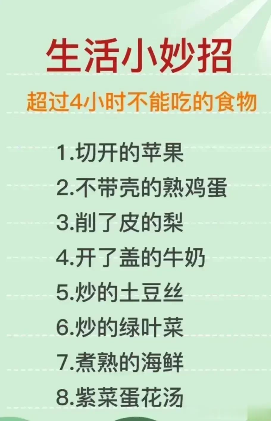 生活小妙招,一定要记住的小技巧 隔夜八不吃 1.隔夜的西瓜细菌多 2.隔夜的土豆不要吃 3.久放的鸡蛋很危险 4.隔夜的海鲜损肝脏 5.隔夜的豆浆不要喝 6.隔夜的木耳坚决不吃 7.隔夜的绿叶菜最危险 8.隔夜汤不放金属器具上