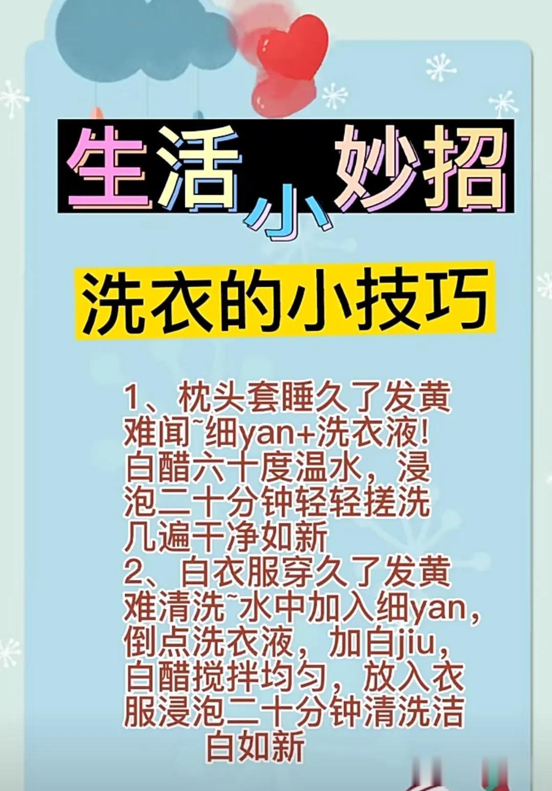 生活小妙招 宝宝衣物清洗小技巧,真的太有用,太实用了! 1、奶渍:冷水+肥皂 2、果渍:苏打粉+肥皂 3、血渍:柠檬汁+食盐 4、汗渍:清水+洗衣液 5、尿渍:酵母粉+洗衣液 6、染色:双氧水+洗衣液 7、油渍:洗洁精+洗衣液 8、发黄:淘米水+洗衣液