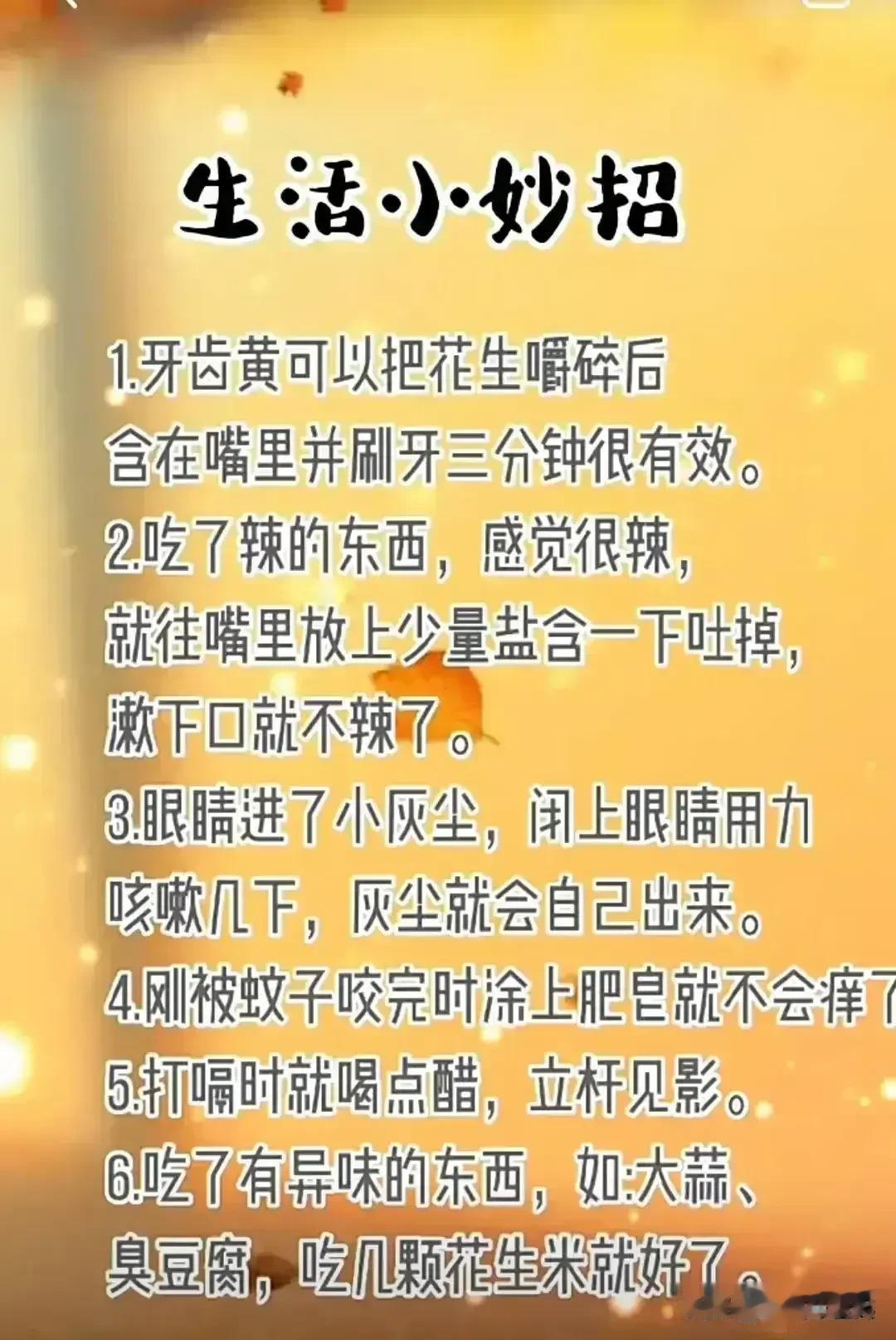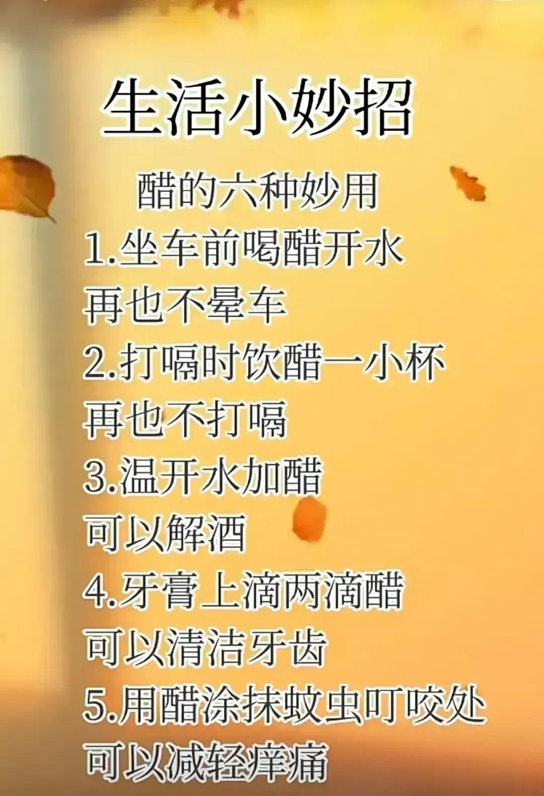 生活小妙招: 醋的六种妙用 1.坐车前喝醋开水再也不晕车 2.打嗝时饮醋一小杯再也不打嗝 3.温开水加醋可以解酒 4.牙膏上滴两滴醋可以清洁牙齿 5.用醋涂抹蚊虫叮咬处可以减轻痒痛