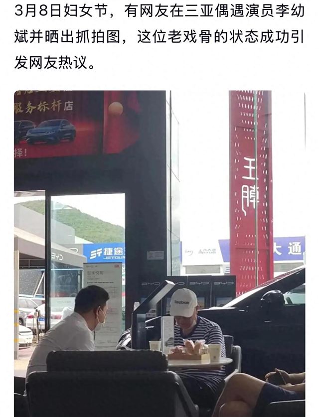 路人拍下照片后发现,李幼斌正站在一家比亚迪汽车4S店门口。