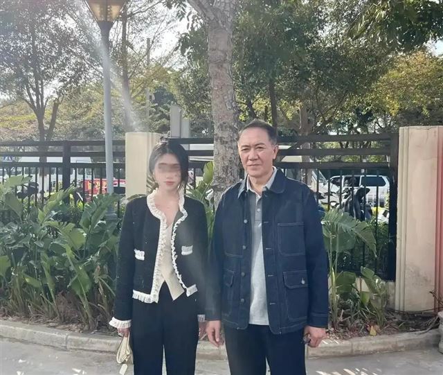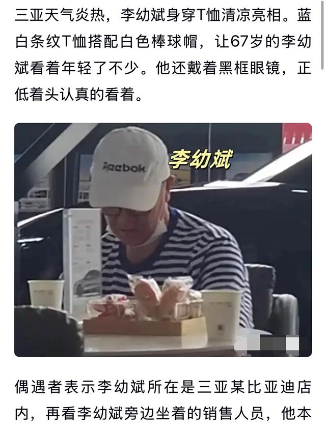 67岁的李幼斌在三亚被路人偶遇,当时他穿着蓝白条纹衫。