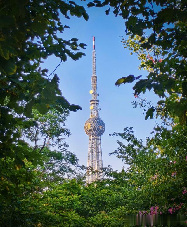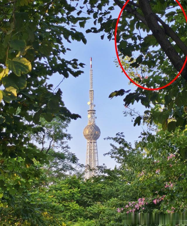 这张照片利用包围构图拍摄远处的塔,但是,因为塔本身比较纤细,而前景的树又过于茂密,就使得这个对比有些失衡,本该作为主体的塔被严重弱化。