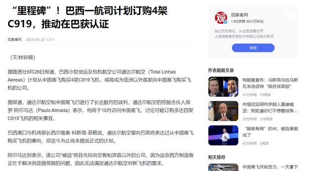 已有来自德国、泰国、尼日利亚等国的订单,其中最具突破性的是2024年9月巴西航空公司计划订购的4架C919。