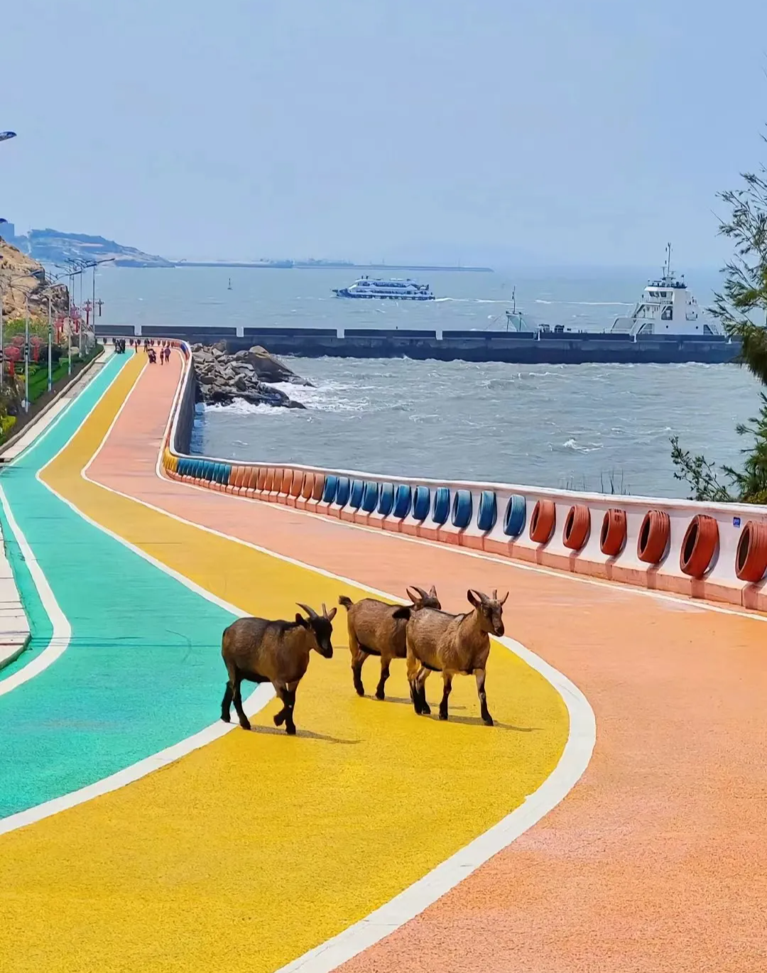 在湄洲岛的海湾转角,你或许会遇到悠闲吃草的小牛和羊儿,它们与海岛的美景相映成趣,构成了一幅和谐的画面。
