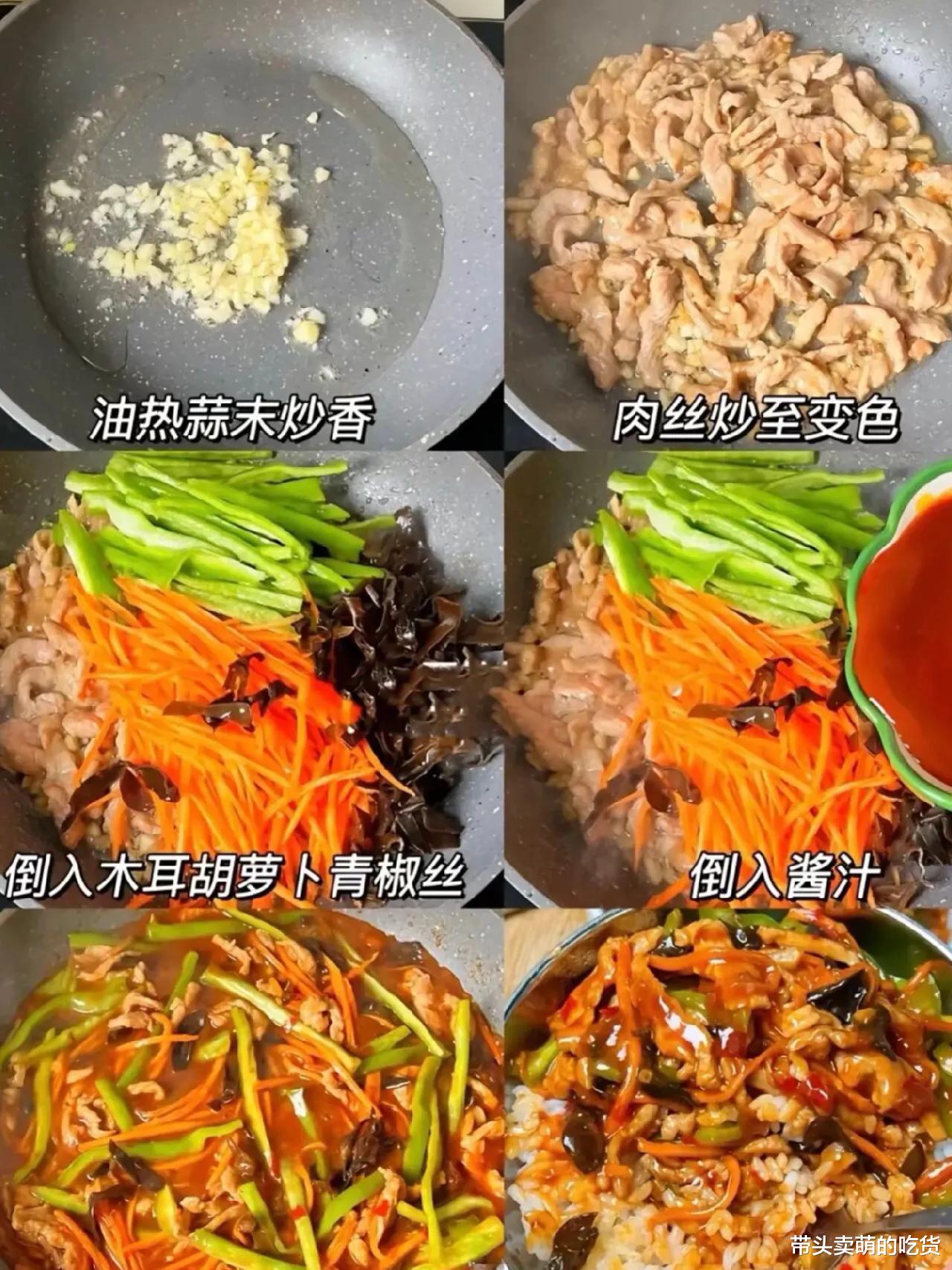 3、起锅烧油6成油温爆香蒜末,接着把肉丝放进去炒至一面变色,接着把胡萝卜丝等蔬菜倒进锅里翻炒2轮,炒至微微变软后倒入鱼香肉丝酱汁,这时候可以转中火慢慢翻炒了,炒至酱汁逐渐变少,就可以关火出锅啦,一定要留少许拌米饭的汤汁,那才是这道菜里的灵魂。