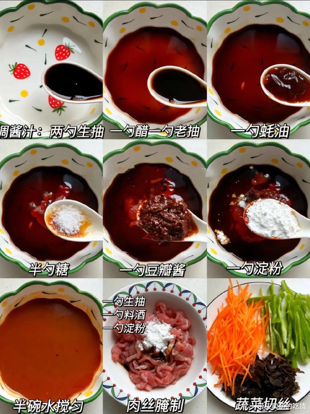 1、先来调制鱼香肉丝酱汁,碗里加入2勺生抽,1勺陈醋,1勺老抽,1勺蚝油,1勺豆瓣酱,1勺淀粉,半勺白糖,再来半碗水,搅拌均匀备用,这是炒菜酱汁,里脊肉切成丝后另外腌制。